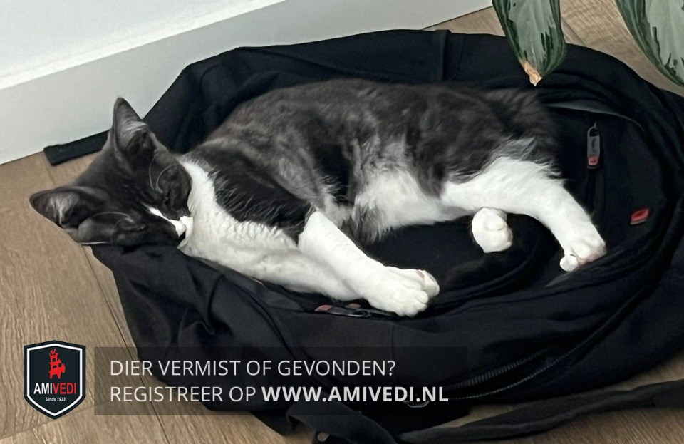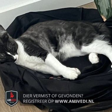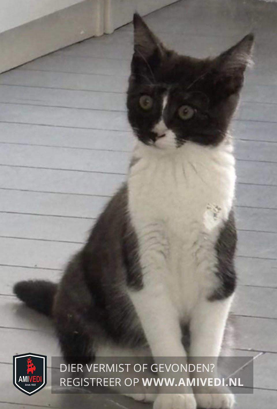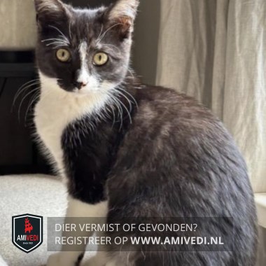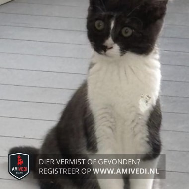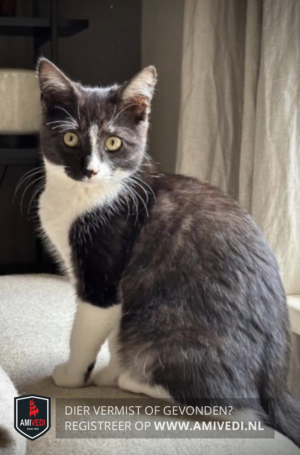| Signalement | Voornamelijk grijs/zwart gemêleerd poesje, witte streep op de neus, zwarte vlekjes op het puntje van de neus, witte hals, borst en buik. Wit op de buik en witte pootjes. |