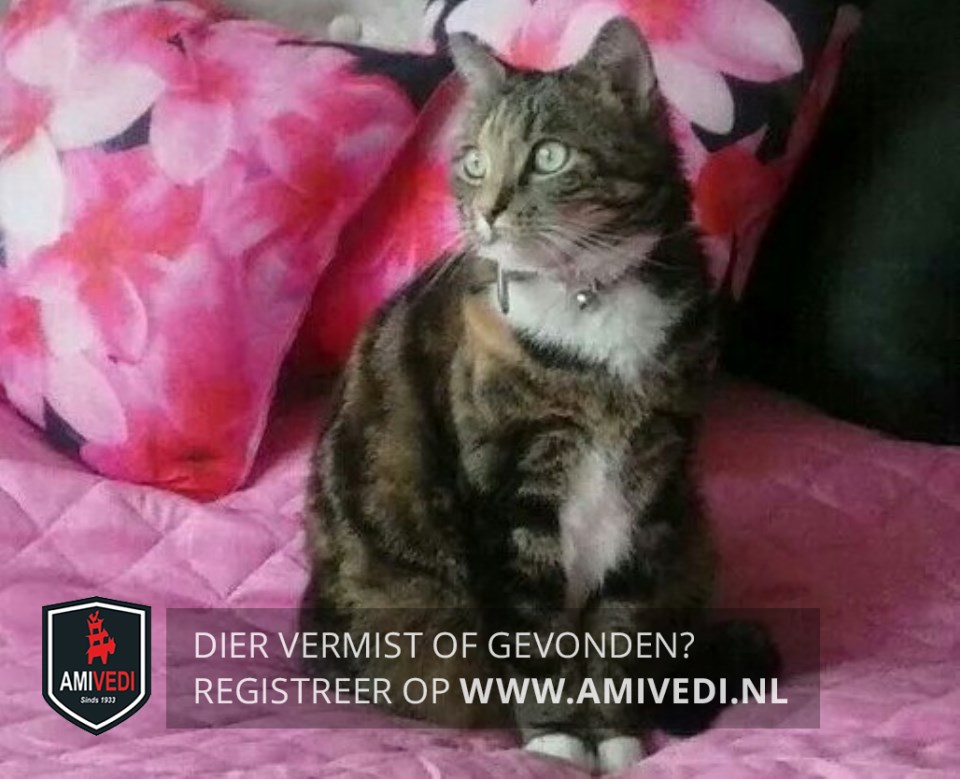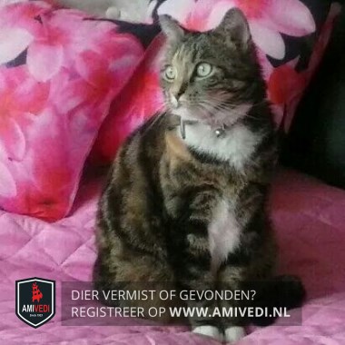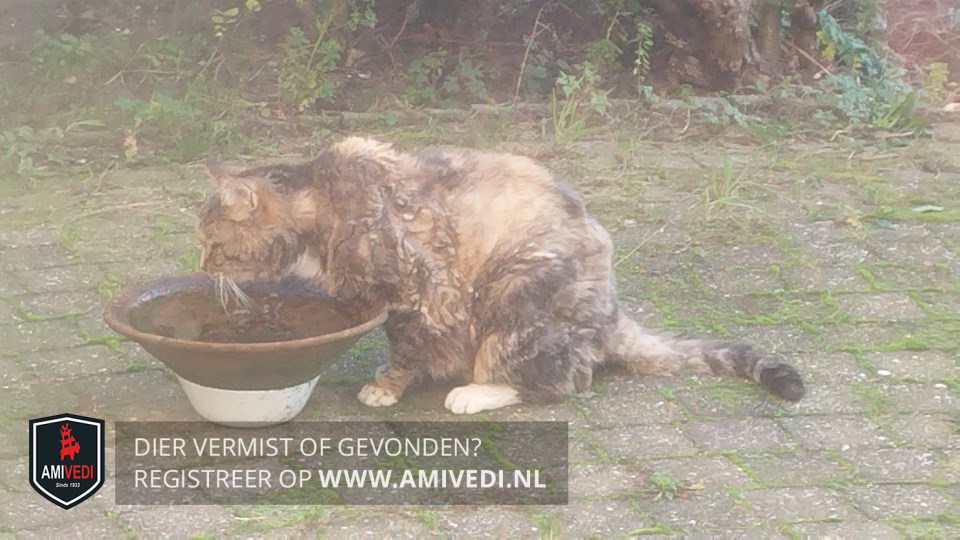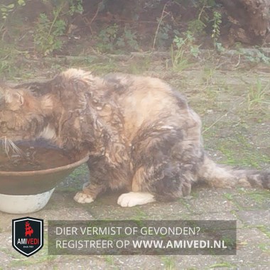| Signalement | Cypers grijs/zwart met wit en rood. Kop cypers grijs/zwart, wit om de bek. Witte bef en wit tussen de voorpoten. Voorpoten cypers grijs/zwart met witte voeten. Achterpoten witte laarzen. Rood op de rechter schouder. Rug rood met wat cypers grijs/zwart. Staart rood, vanaf halverwege cypers grijs/zwart. Oud erg mager lapjeskat , zit in laatste fase gebruikt pijnstilling. Vacht is recent geknipt dus is ongelijk omdat ze niet meer kan schoonmaken Tweede foto is toen ze jonger was. |