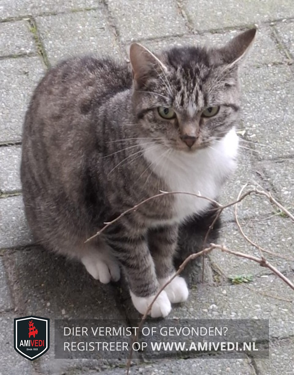 | Signalement | Grijs met zwart gestreept en wit. Klein wit vlekje tussen ogen. Witte kin, hals, bef, borst, voetjes. |