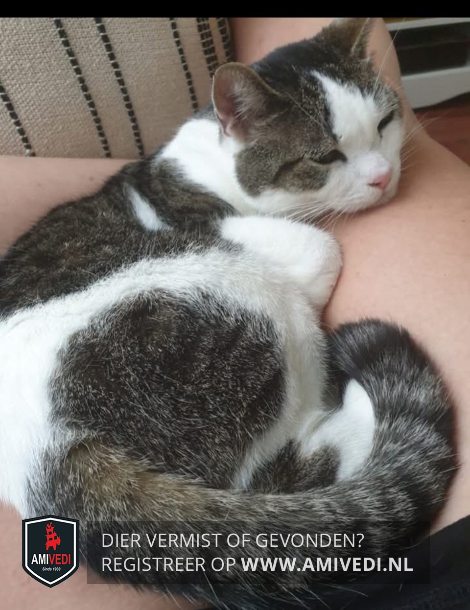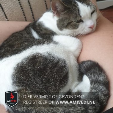 | Signalement | Kop wit, cypers grijs/zwart over de oren, rechts tot onder het oog. Nek wit. Rug cypers grijs/zwart, witte baan over het achterlijf. Lijkt iets aan de heupen/achterlijf te mankeren. |