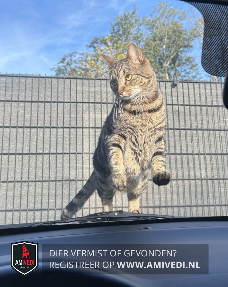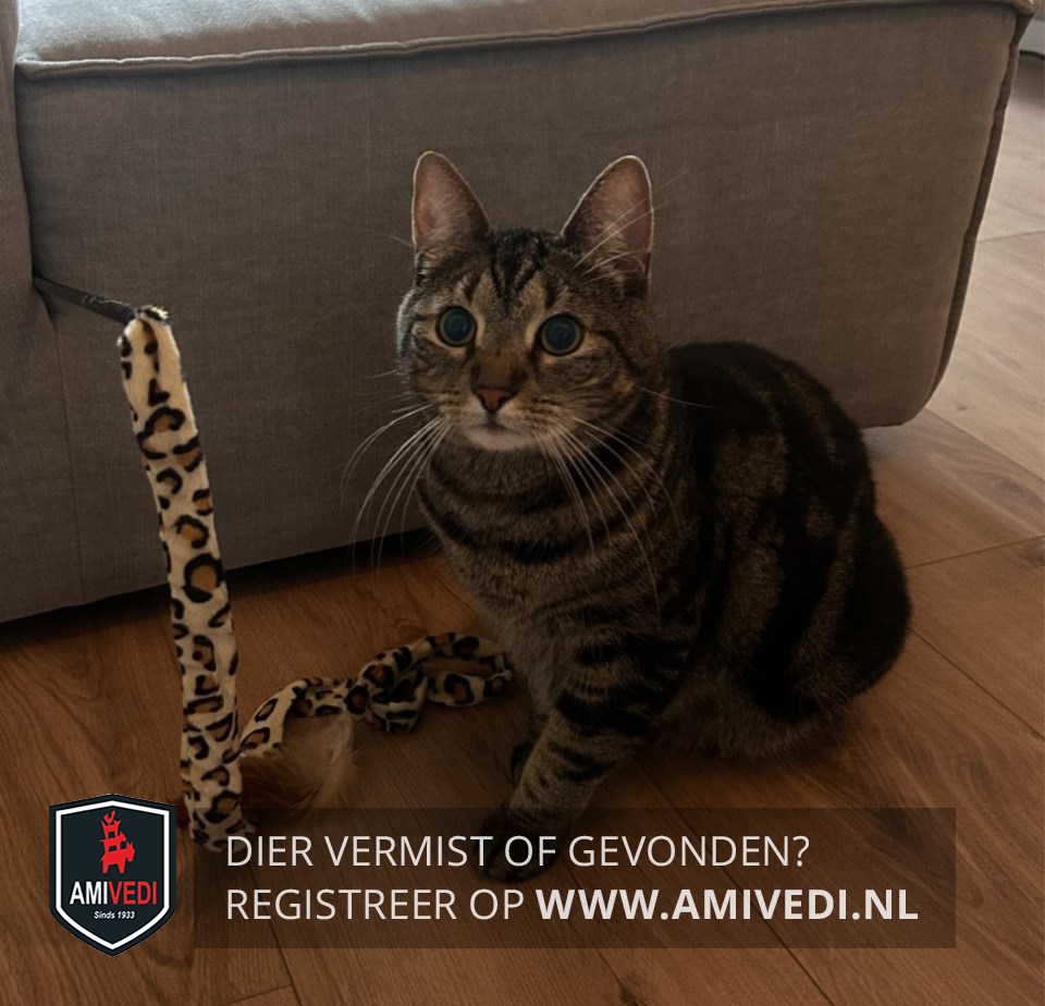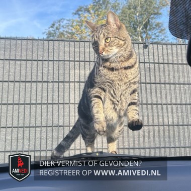 | Signalement | Cypers bruin, zwart gestreepte kater met witte snor en witte kin. Licht randje rond de ogen. |