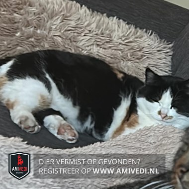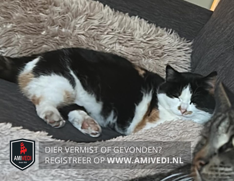 | Signalement | Lapjeskat. Zwart met wit en rood. Onderste helft kop wit. Rode vlekjes beide kanten neus. Witte neusbrug. Bovenste helft kop zwart. Witte keel, witte borst. Rode vlek Achter rechtervoorpoot. Zwarte rug met rode vlekjes erdoor. Witte buik. Rechterachterpoot witte laars met rode vlekjes. Linkerachterpoot witte sok. Witte vlek op de billen. |