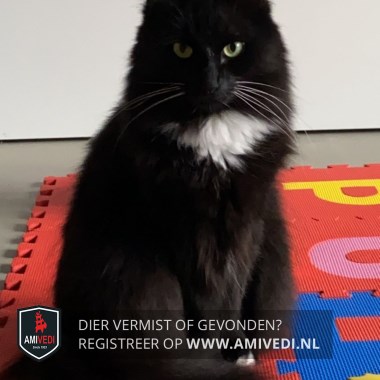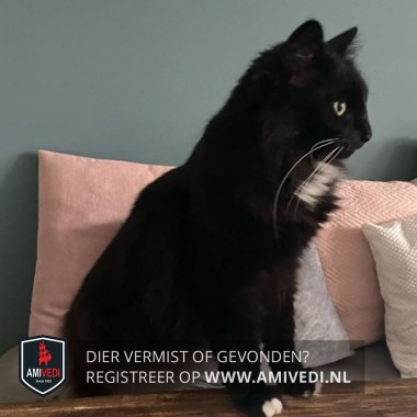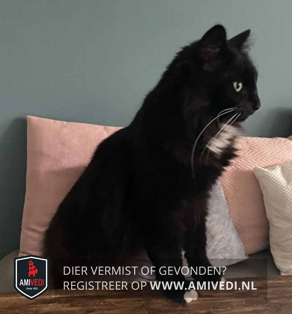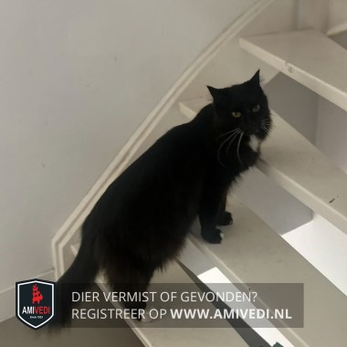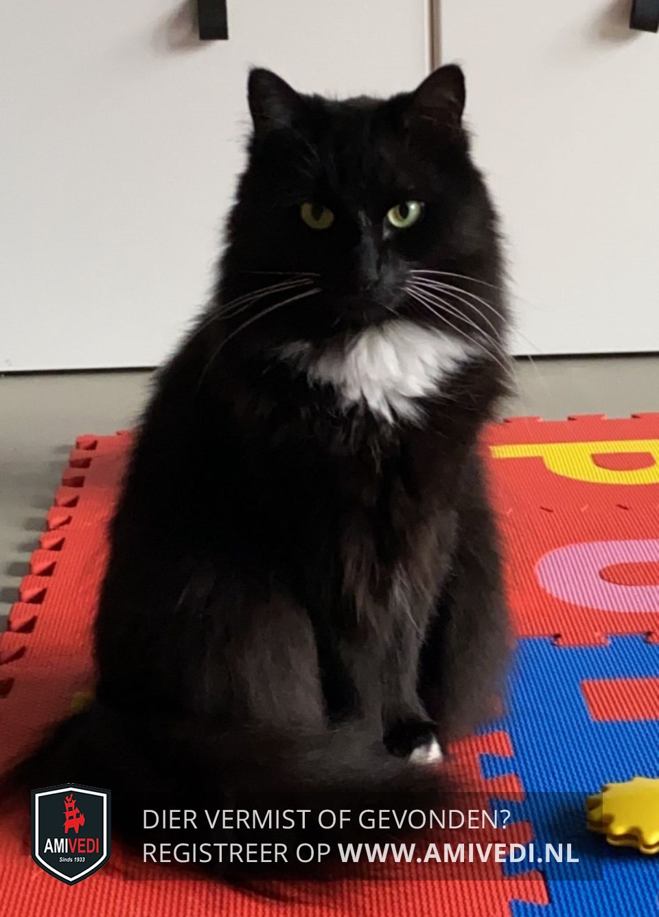 | Signalement | Zwart langhaar met een paar witte accenten. Witte bef, snorharen, teentjes voorpoten en rechter achterpoot. Groene ogen en zwarte pluimstaart met een knikje aan het uiteinde. |
