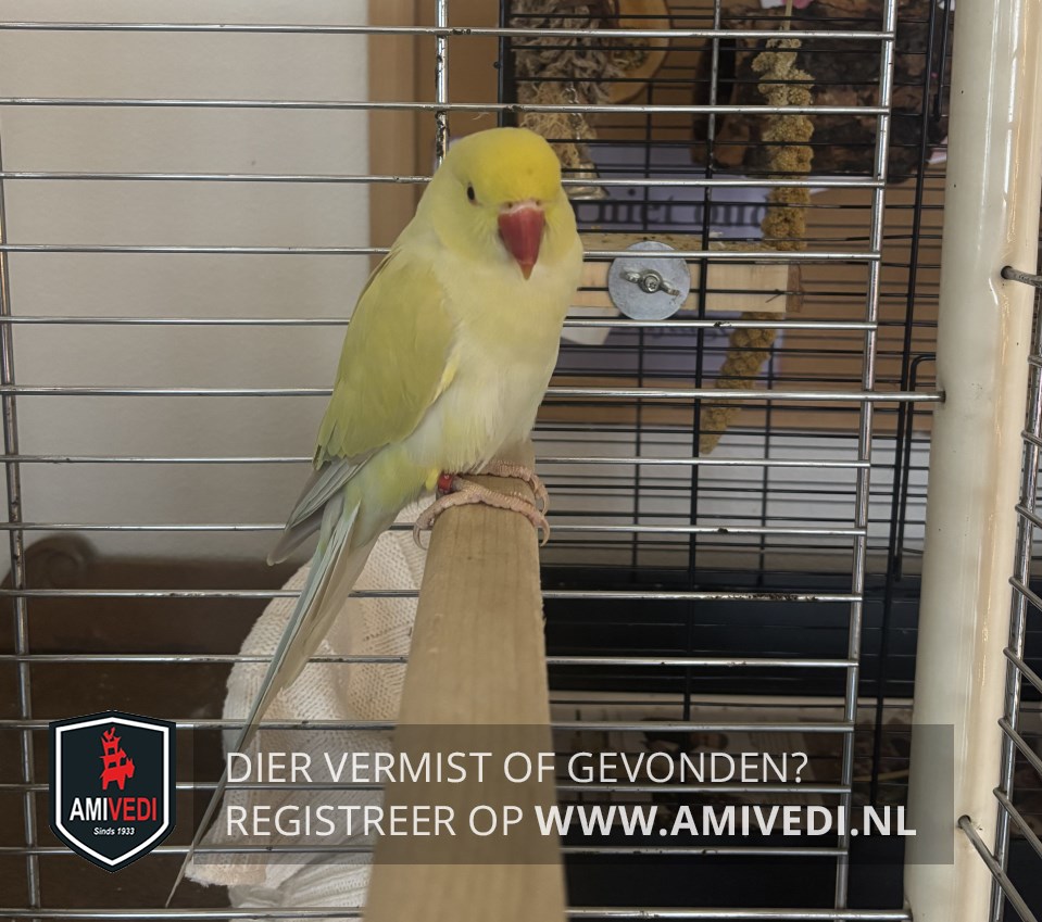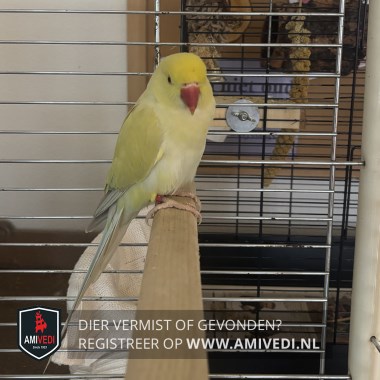 | Signalement | Gele halsbandparkiet met een grijze staart.. Draagt een ring |