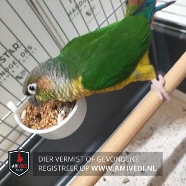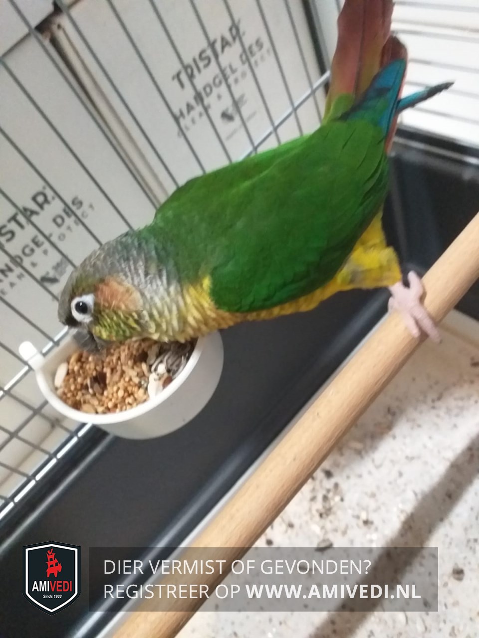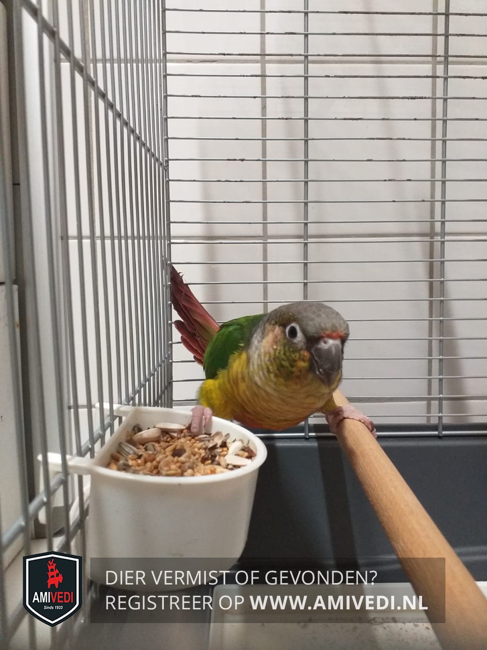 | Signalement | Groene rug, gele buik, rode staart en grijze kop. Vrij tam. |