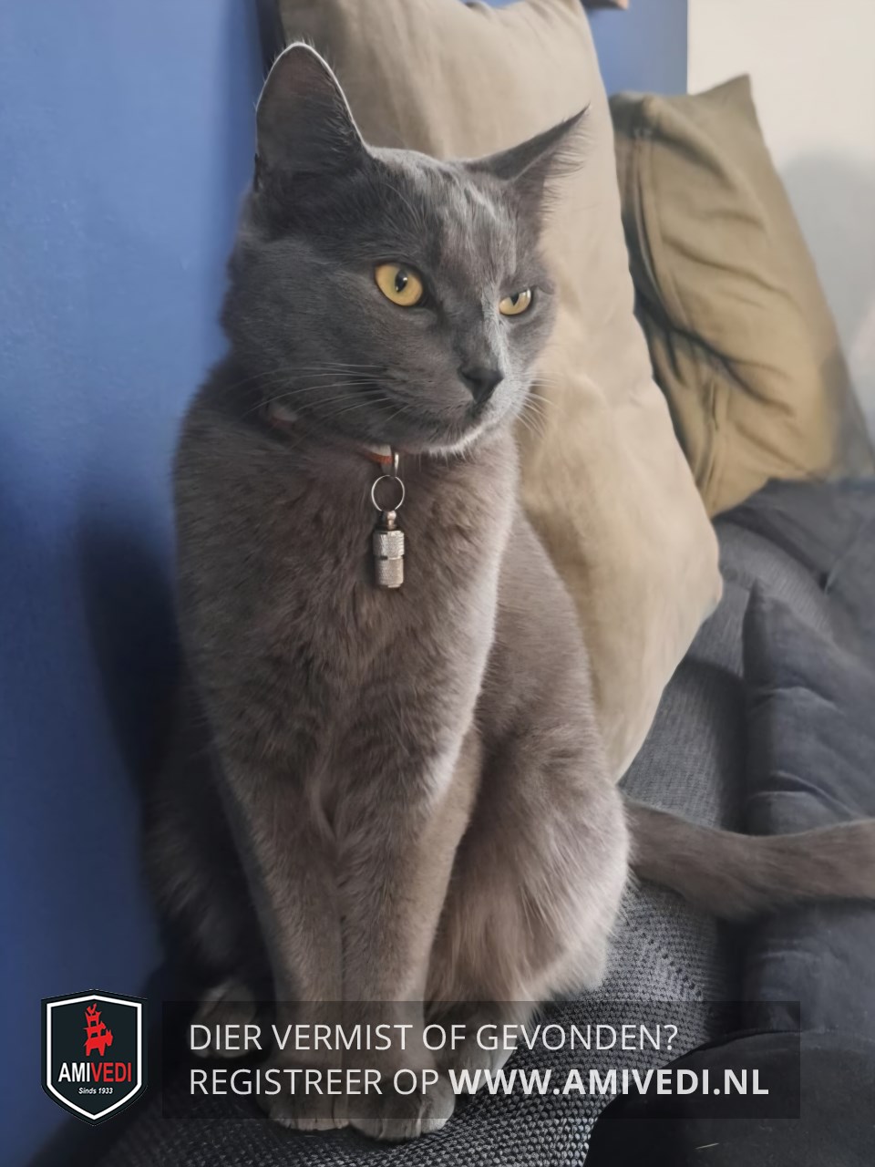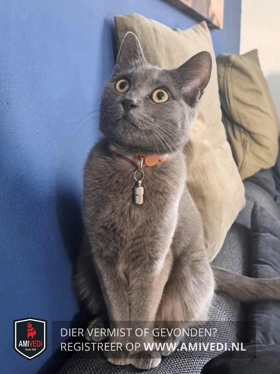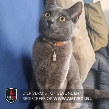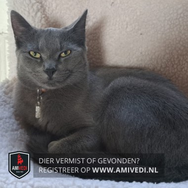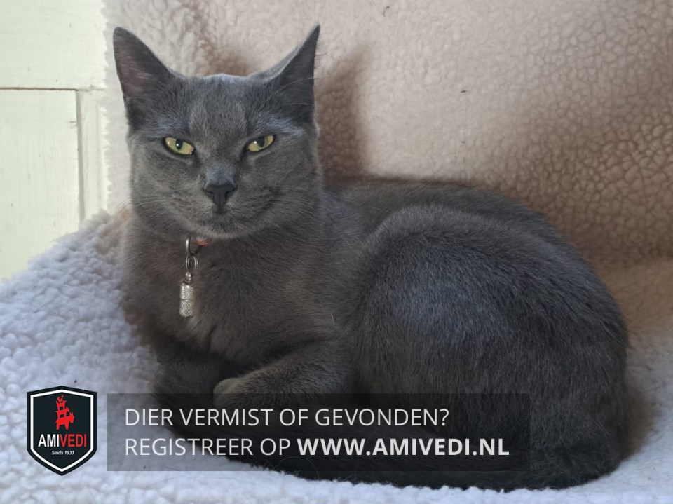 | Signalement | Egaal grijze dikke vacht, gele ogen. Klein wondje tussen de oren en een kaal plekje op de linkerbil. |