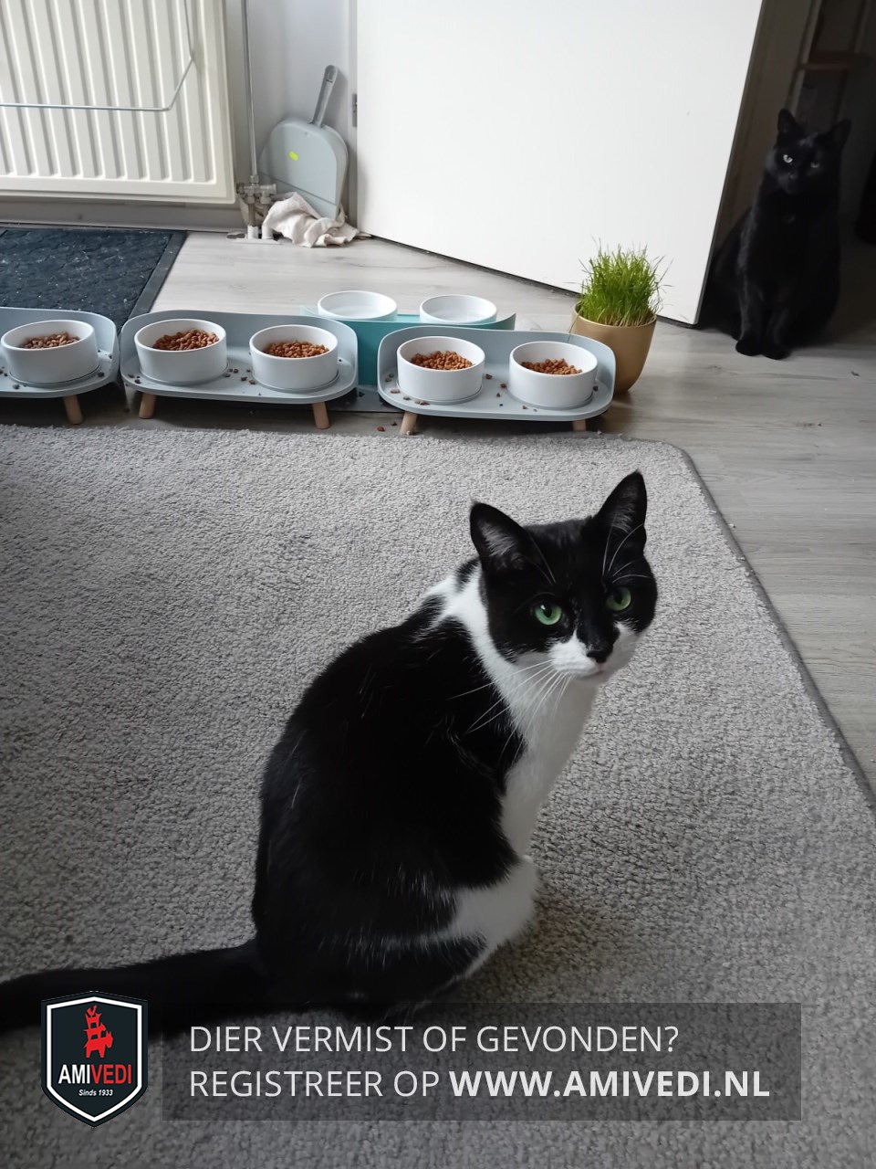 | Signalement | Zwart met wit; zwarte kop met wit masker, zwarte rug en staart, witte hals nek buik voor en achterpootjes |