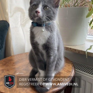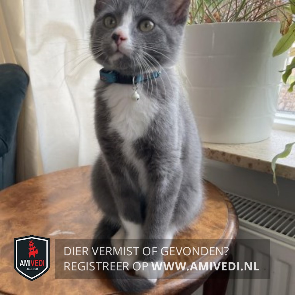 | Signalement | Grijs met witte kater, witte bles, wit naast de neus, zwarte vlek op roze neus, witte plek rechtsonder de mond, witte bef doorlopend in een witte streep op borst/buik, witte voet linker voorpoot, witte kniekous linker voorpoot, witte voeten achterpoten. |