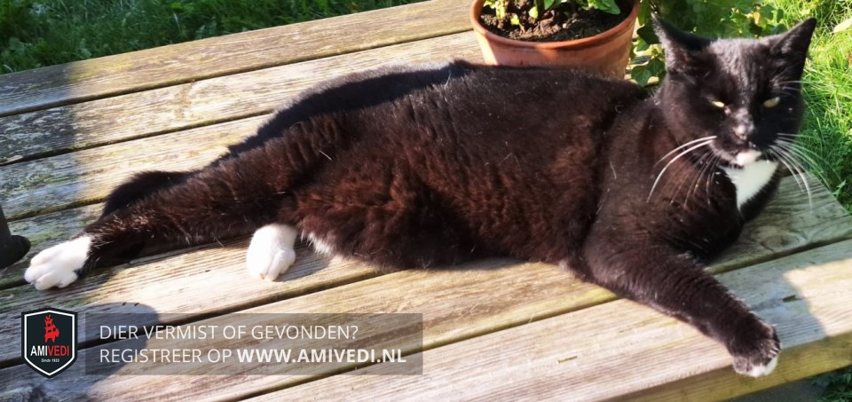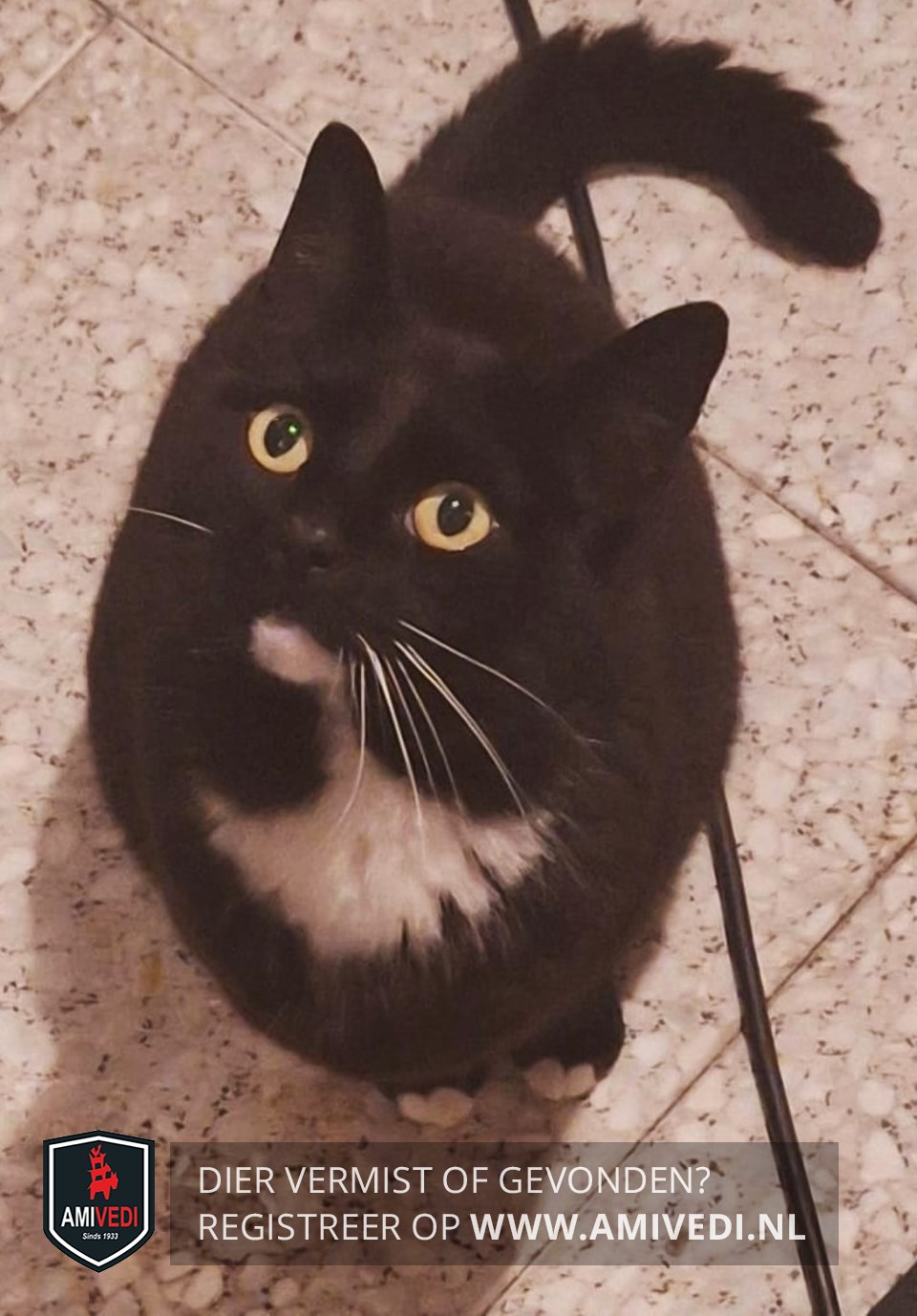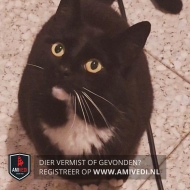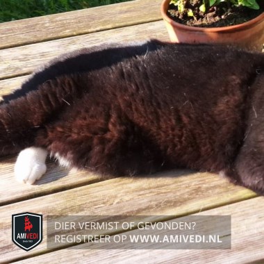 | Signalement | Zwart met wit. Voornamelijk zwart met een donkerbruine ondervacht, kin wit, op de hals een smalle witte streep naar de bef, witte bef, voorpoten enkele witte tenen, achterpoten witte voetjes. |