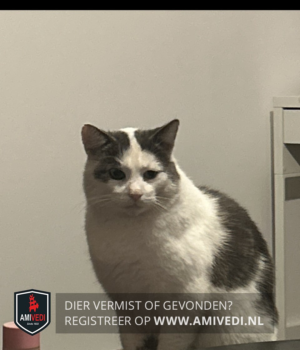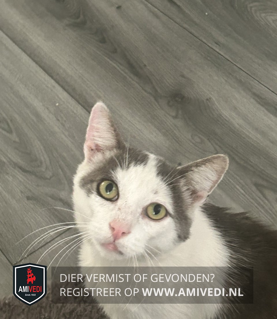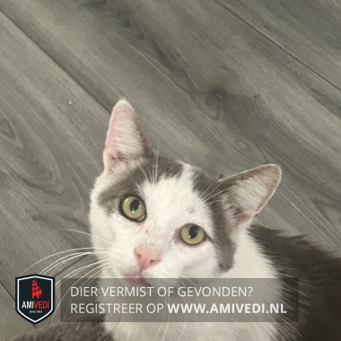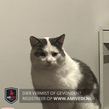 | Signalement | Wit met grijs: grijs rond de oren tot langs de ogen; rechts op de borst naar de nek toe; rug en flanken deels grijs; staart deels grijs met een witte ring halverwege; grijs vlak op de rechterachterpoot |