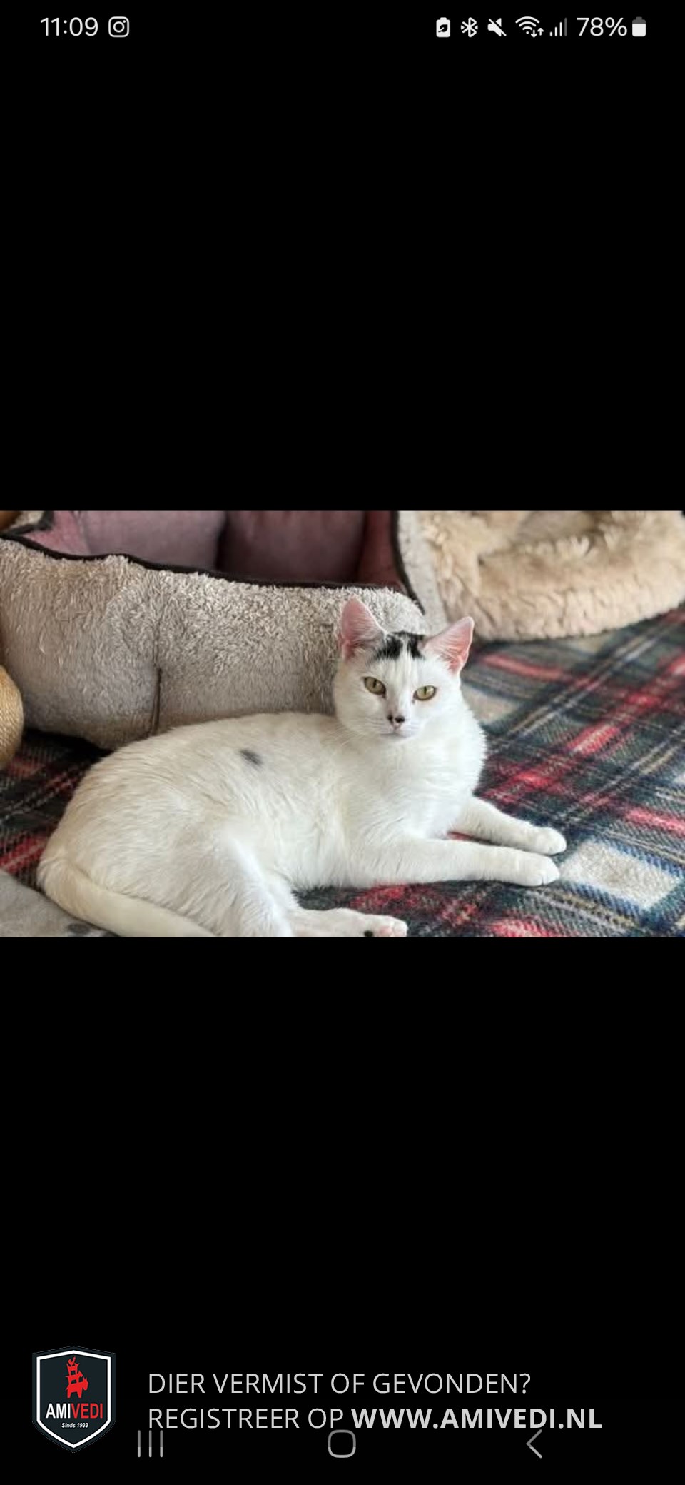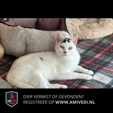 | Signalement | Geheel witte dame met op de kop zwarte vlekken/ strepen. Op de neus heeft ze twee zwarte stippen en over het lijfje heeft ze hier en daar een zwart vlekje. |