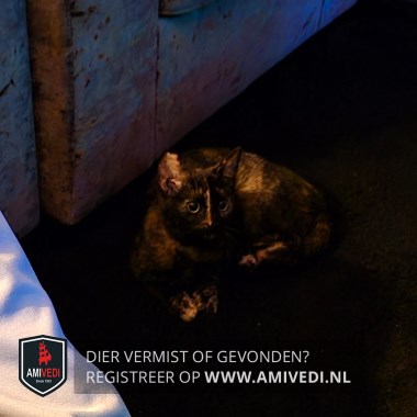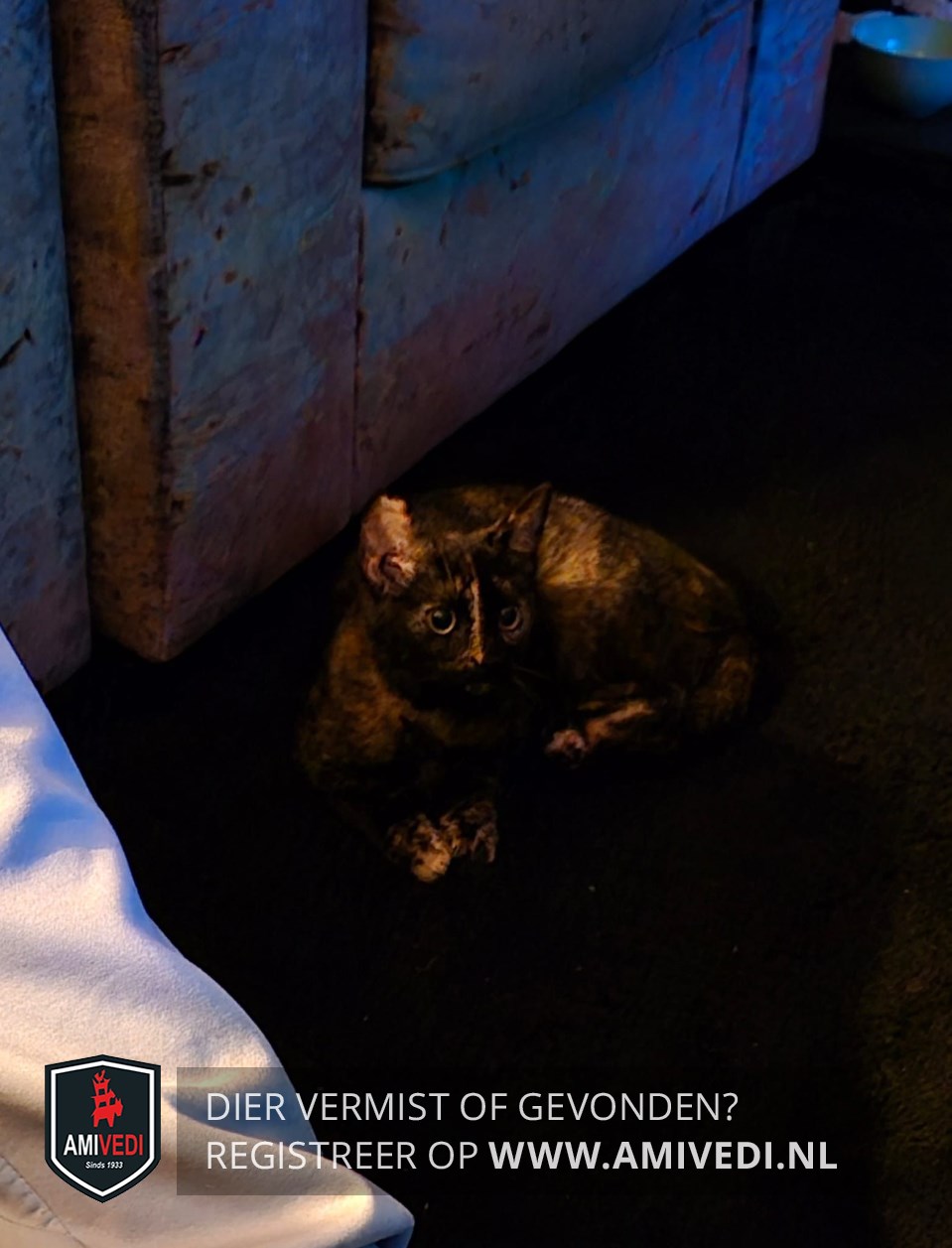 | Signalement | Jong poesje . Schildpad. gemeleerd, voornamelijk zwart kopje met bruin oranje streepje op de neus. 1 lichter oortje de andere donkerder. bruine oranje vlekjes bij de voorpootjes en gemeleerde staart. |