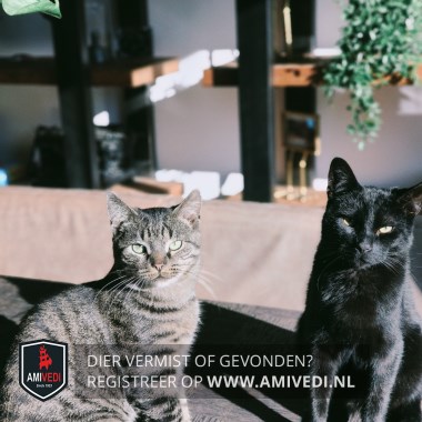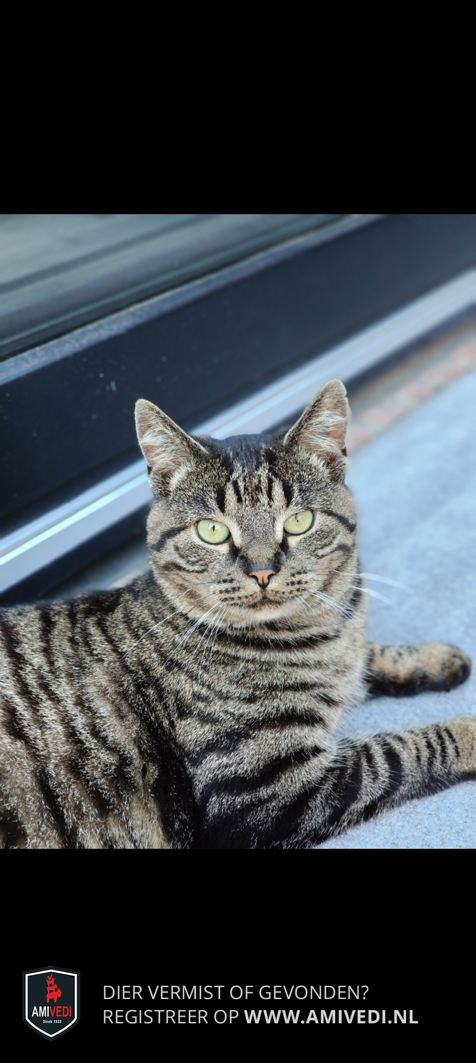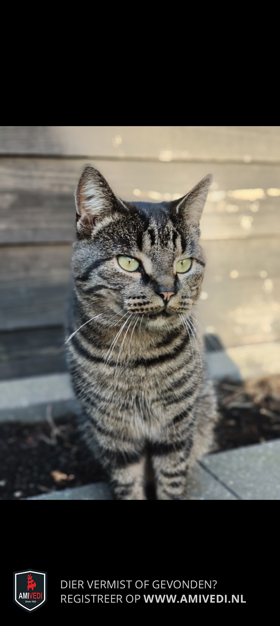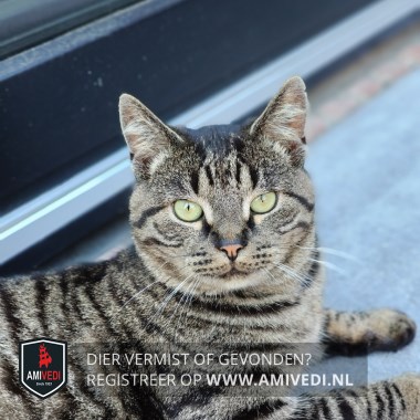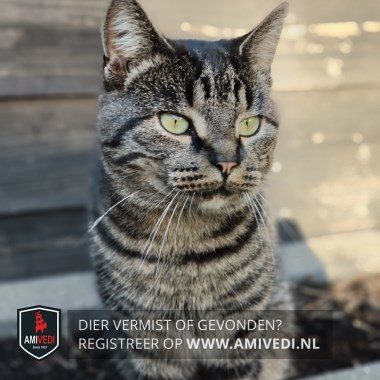 | Signalement | Grijs/bruin met zwart gestreept, lichtbruin in de ooghoeken, witte snorharen. |