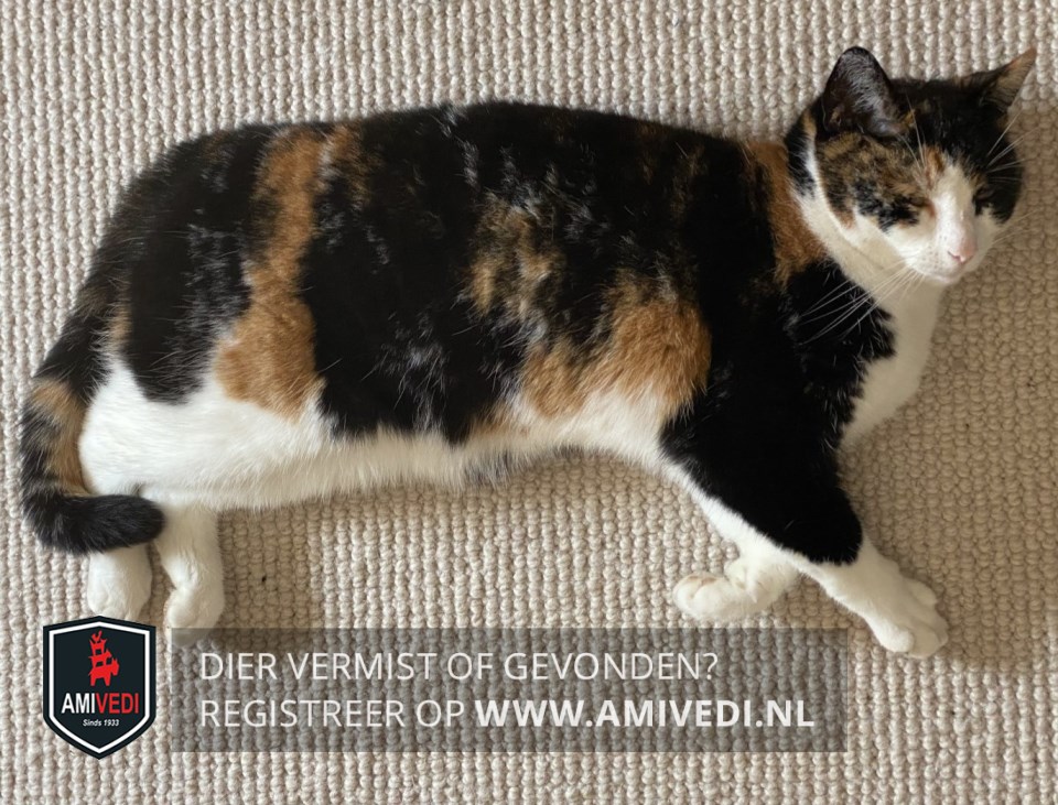 | Signalement | Lapjespoes. Witte snuit. Over linker oog meest zwart, over rechter oog meest rood. Witte borst en buik. 4 witte poten, over de rechter voorpoot 2/3 zwart. Rug, flanken en staart zwart-rood. |