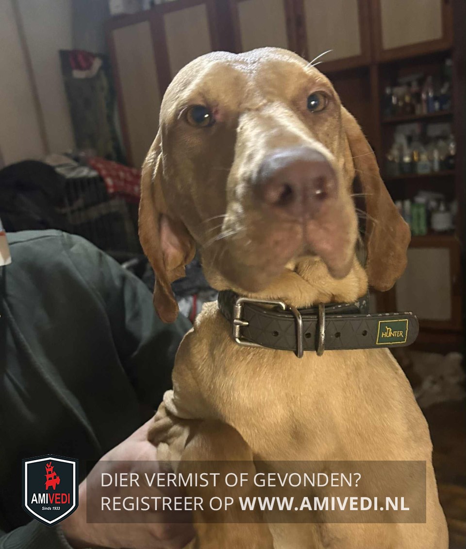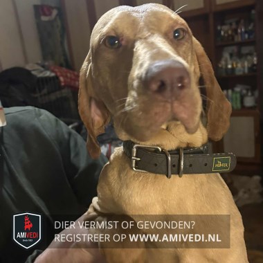 | Signalement | Lichtbruin. Schuw en mager hondje. Heeft de rode jachtlijn nog aan. |