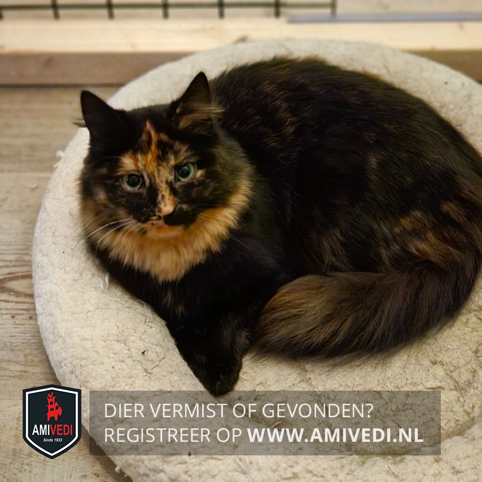 | Signalement | Langharige zwart met rood/oranje poes. Zwart kopje met oranje/rode tekening rondom de ogen en de neus. Oranje kin en bef. Zwart lijfje met enkele lichte oranje vlekjes. Zwart met oranje pluimstaart. |
