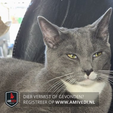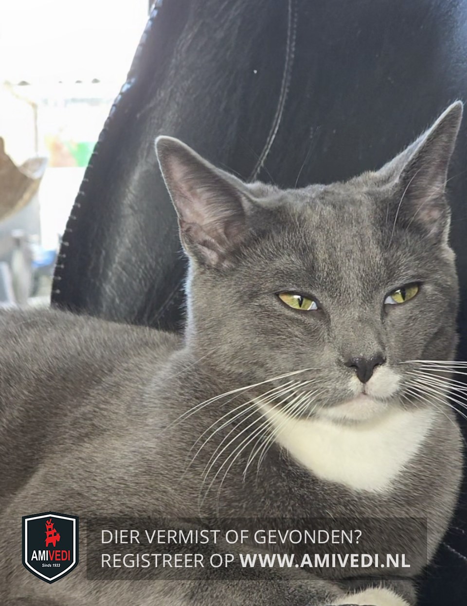 | Signalement | Grijs met wit, groene ogen, witte snorharen, donker grijze neusgaten, bekje linker bovenkant wit, rechterkant boven kant bekje klein wit plekje, witte kin |
