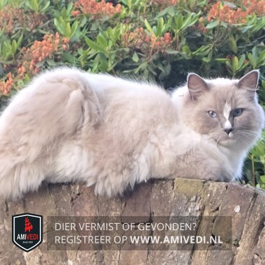 | Signalement | Wit met grijze snoet, wit plekje op neus, grijs op rug, poten en staart, topje staart is wit. |