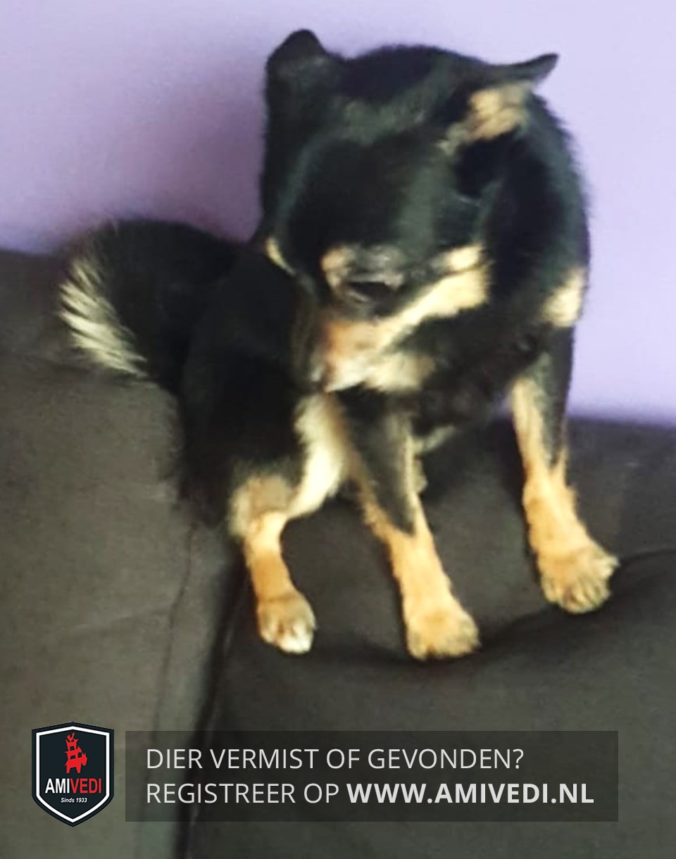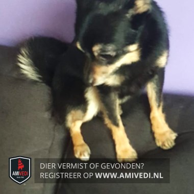 | Signalement | Zwart met bruin (Black&Tan). Voornamelijk zwart, in de oren bruin, boven beide ogen een bruine vlek, beetje bruin op de wangen, rond de snuit bruin, bovenop de snuit zwart, bovenaan de voorpoten zwart de rest van de poten bruin, buik beige/blond, achterpoten meest bruin, onderkant staart beige/blond. |