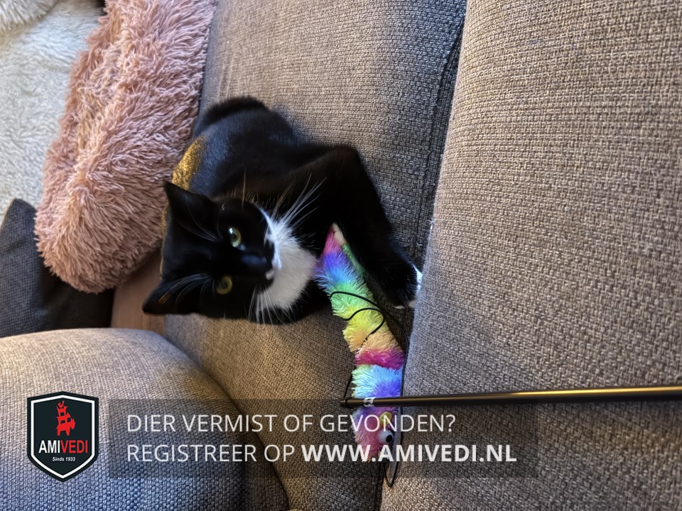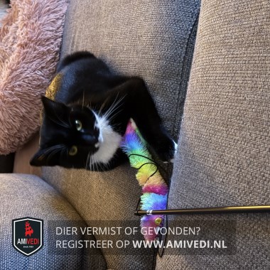 | Signalement | Helemaal zwart met witte snorharen, wit rondom bekje, witte bef , witte teentjes. |