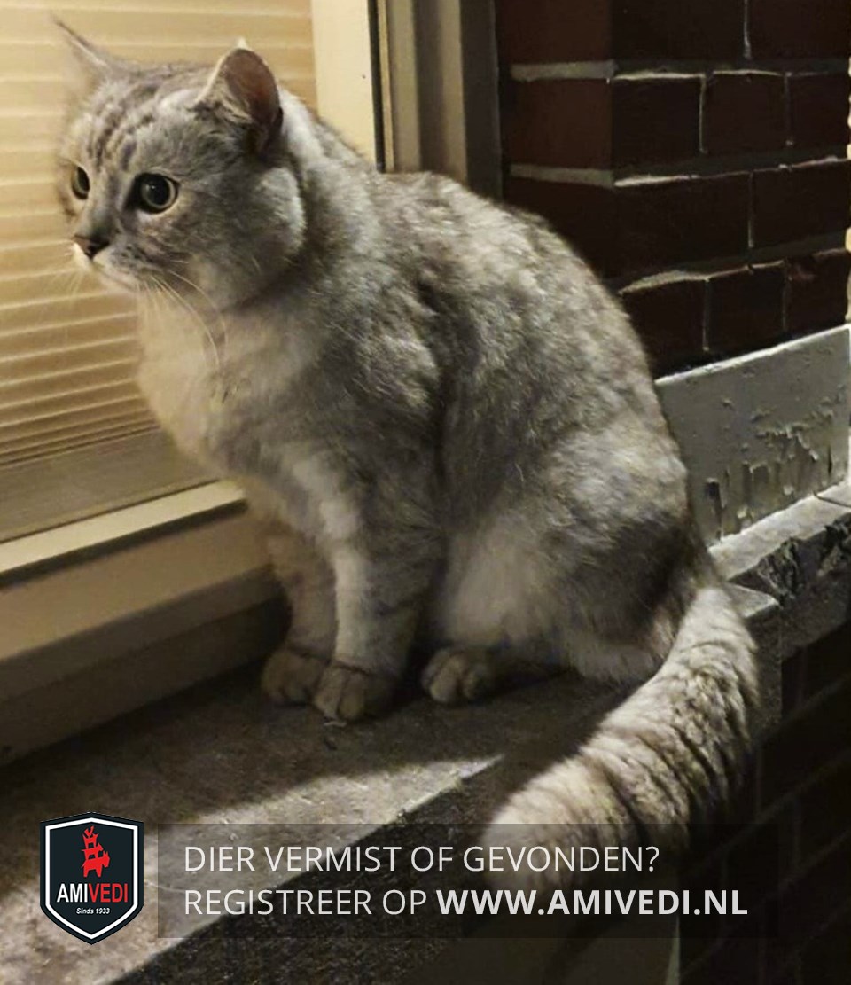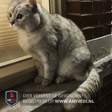 | Signalement | Silver-Tabby. Cypers lichtgrijs zwart gestreept met wit. Voornamelijk cypers lichtgrijs, donker neusje, onder het neusje en kin wit, heeft een witte ondervacht. |
