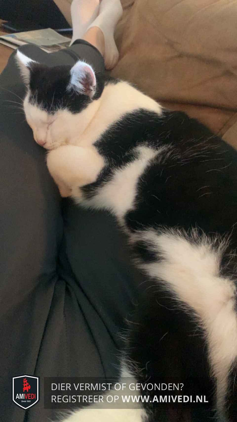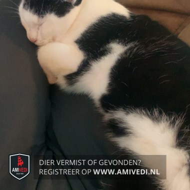 | Signalement | Zwart wit gevlekte kat. Zwart op het kopje geheel witte oortjes en wit snoetje wangetjes en neusje. Zwart wit gevlekt over het lijf witte buik en 1wit zichtbaar pootje. |