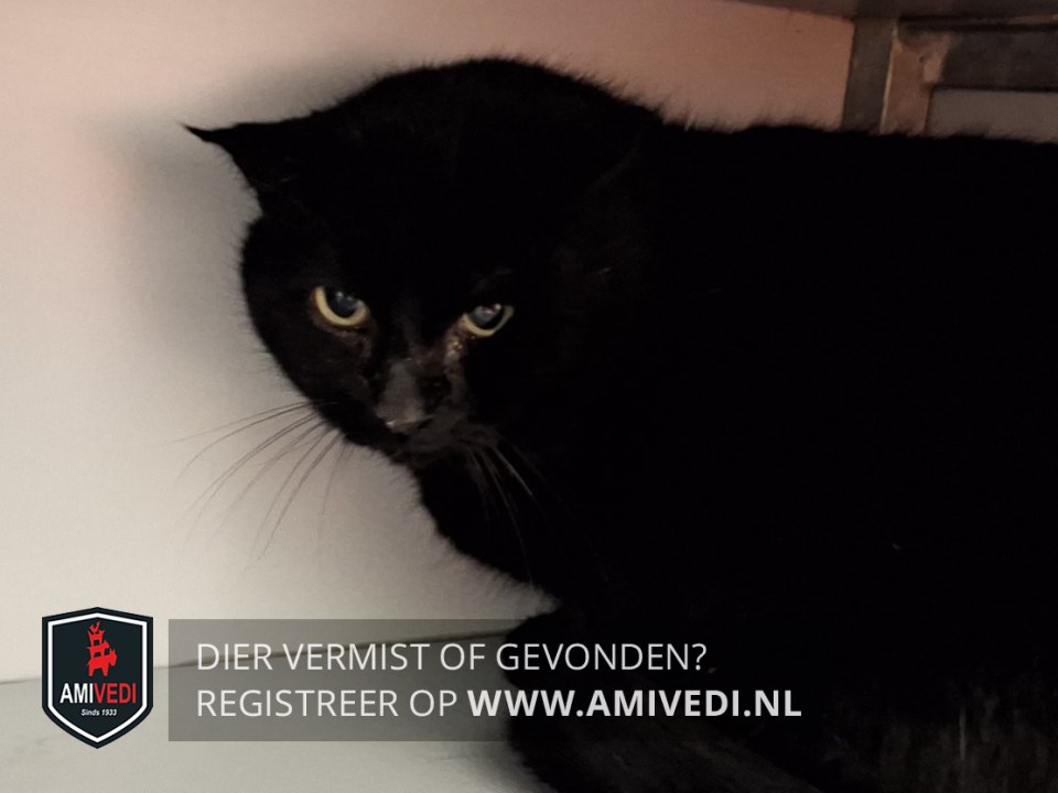 | Signalement | Zwart, gele ogen, wondje bij linker ooghoek. |