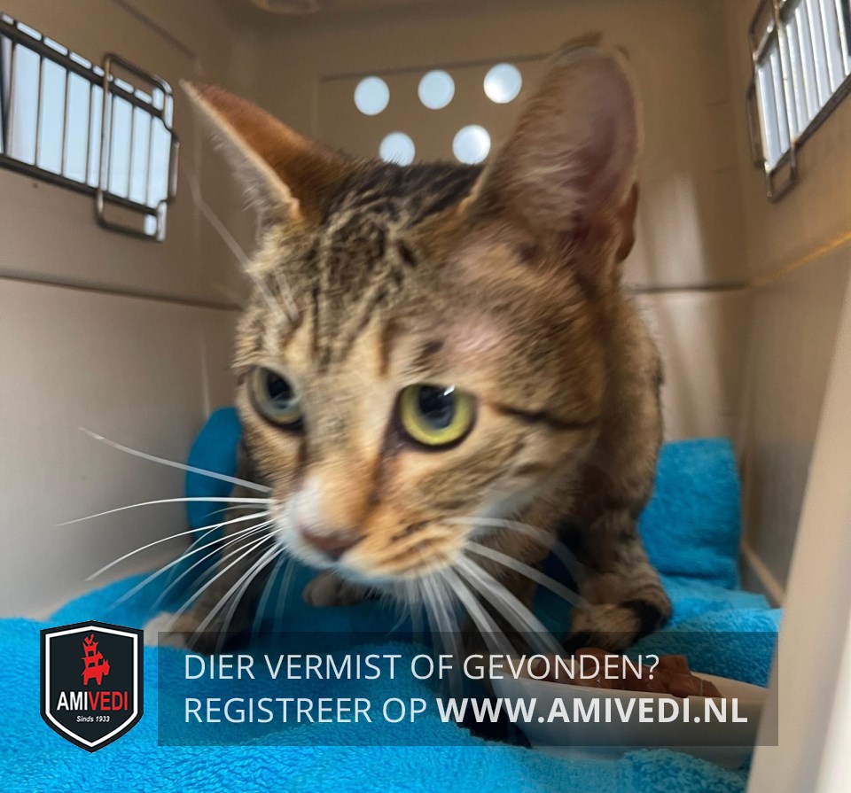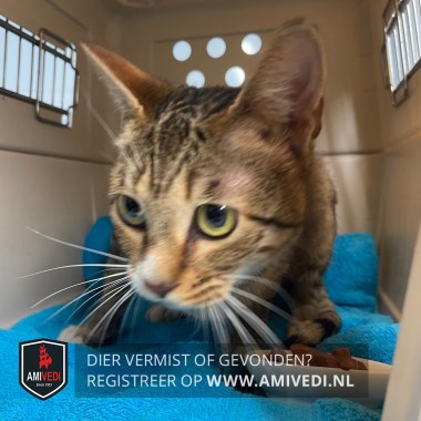 | Signalement | Cypers roodbruin/grijs/zwarte poes, bruin neusje, wat wit bij het bekje, witte snorharen, wit befje. Witte teentjes. Vlekje rechts op de neus. Mager en slechte vacht. |