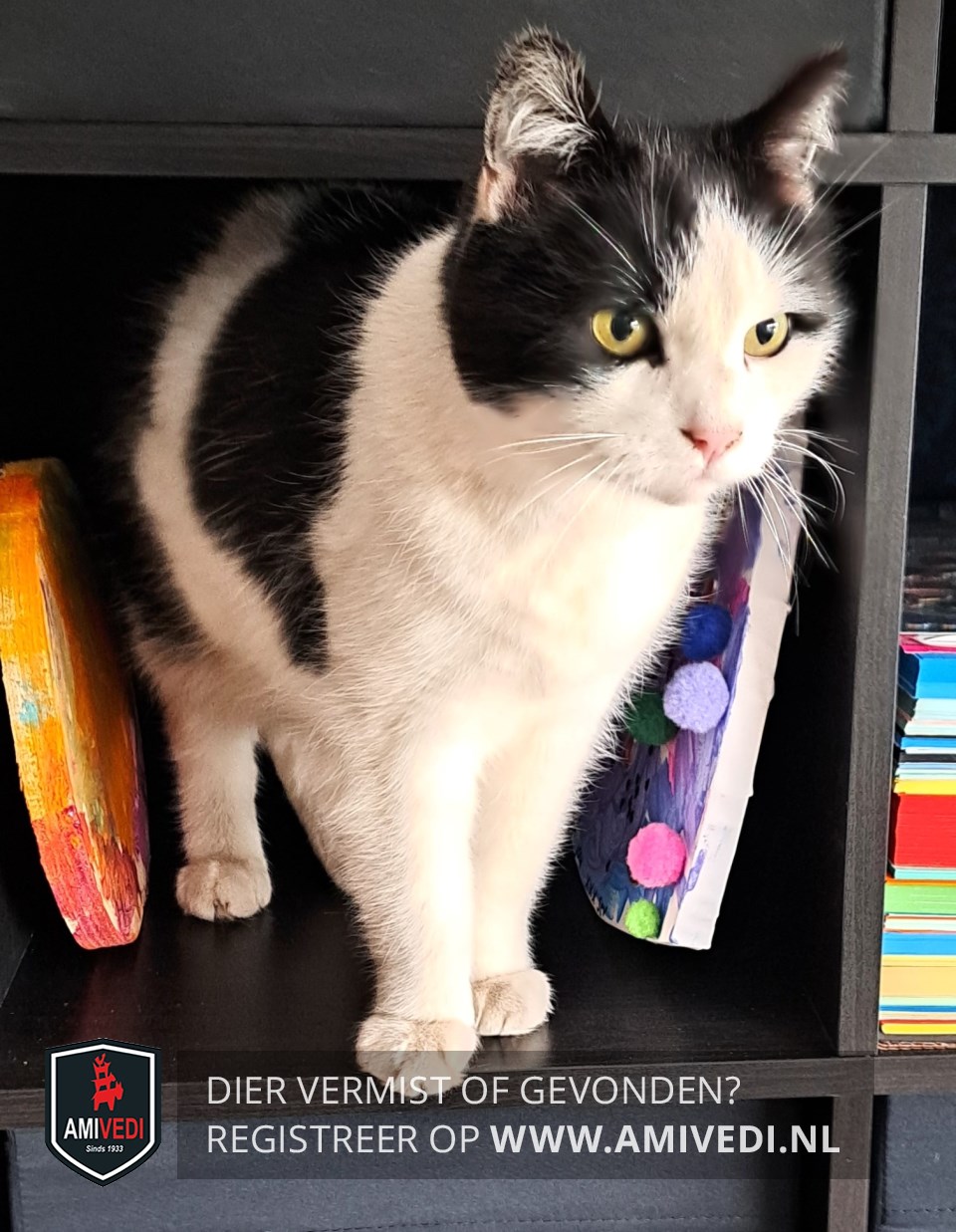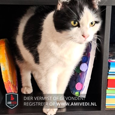 | Signalement | Wit met zwart. Voornamelijk wit, oren, rond de oren, zijkanten kop en rond rechteroog zwart, links tot het oog, roze neusje, op de rug brede zwarte banen van rechts naar links over de flanken. Allemansvriend. |