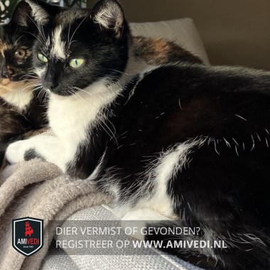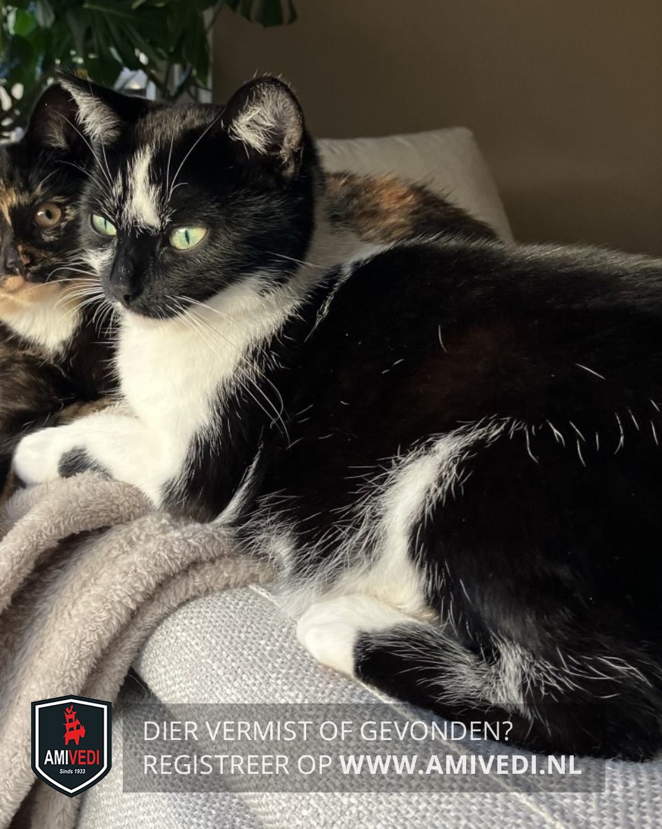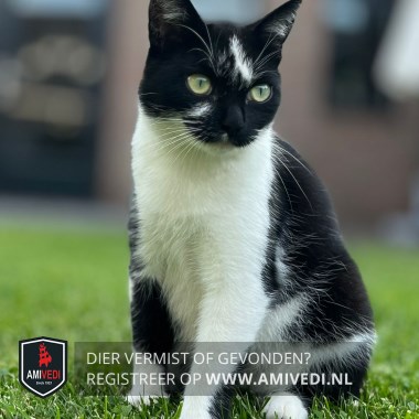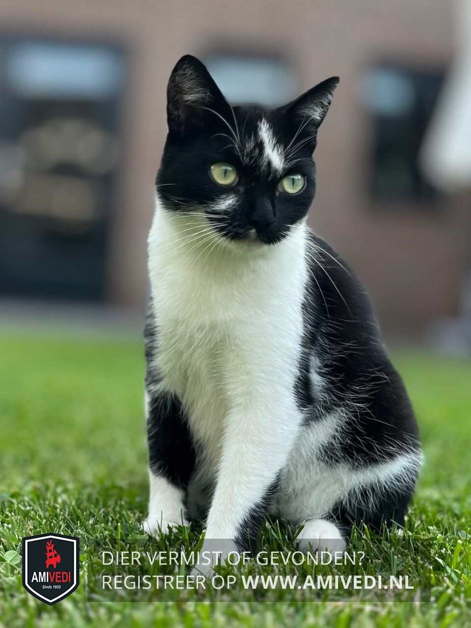 | Signalement | Kat zwart met wit. Zwart kopje met wit streepje op voorhoofd en wit streepje onder rechteroogje. Witte kin, hals, borst en buik. Linker voorpootje wit met zwarte vlekachterzijde en rechter voorpootje zwart en wit. Linker achterpootje wit sokje. |