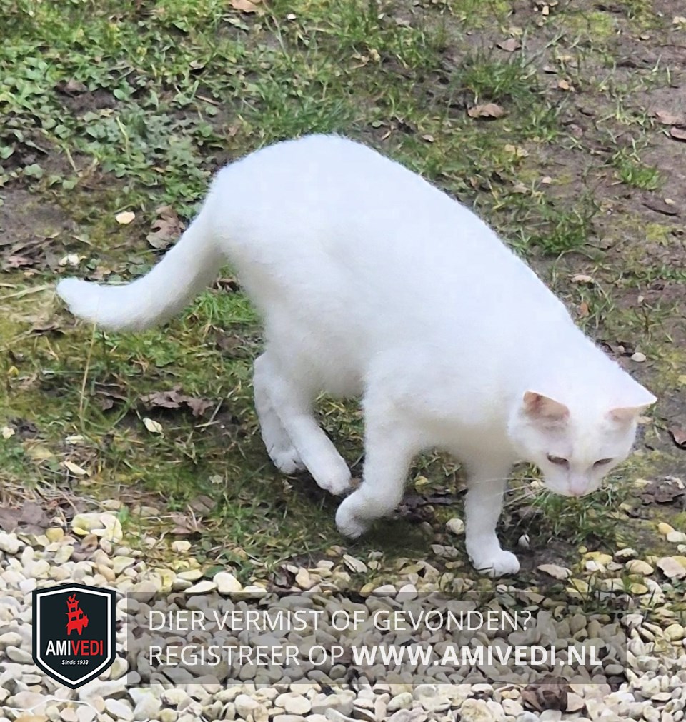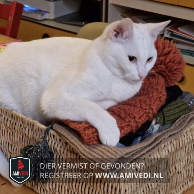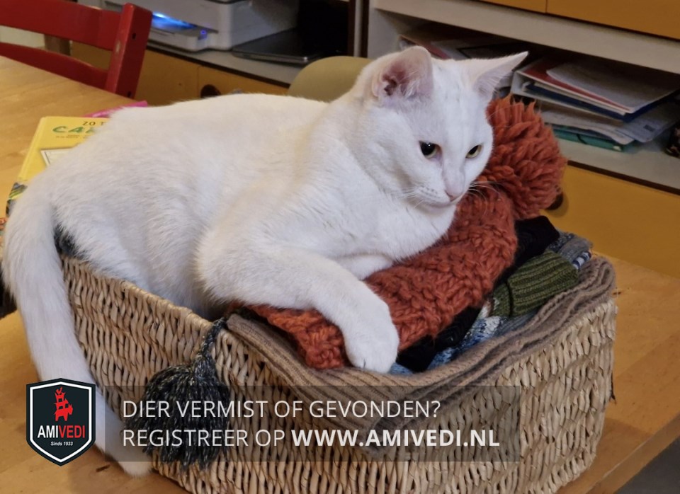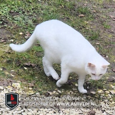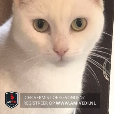 | Signalement | Volledig wit, roze oren en een klein zwart vlekje tussen de oren. |