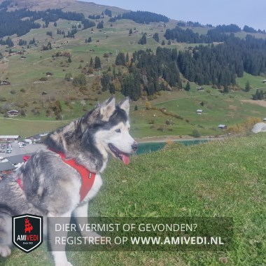 | Signalement | Wit met grijs en zwarte Husky tussen de oren zwart, witte bles, witte keel en borst, vacht grijs met zwart, witte poten, staart grijs met zwart |