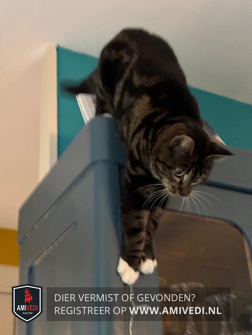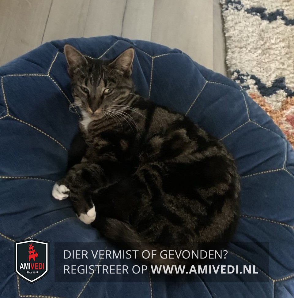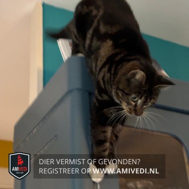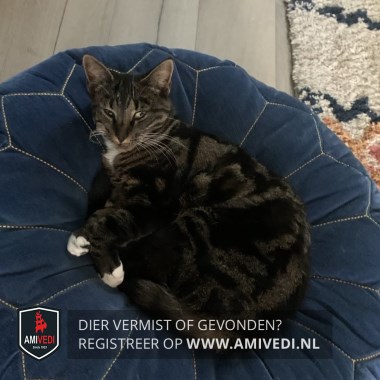 | Signalement | Cypers/gemarmerde bruin/zwarte poes. Wat lichtbruin op het bekje. Beetje wit op de hals en witte teentjes. |