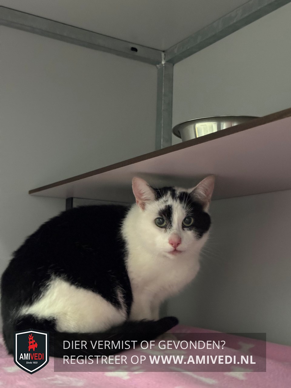 | Signalement | Rechteroortje is zwart, links deels zwart. Linkerkant van het gezichtje zwarte vlek van oor tot kaak. Boven rechteroog een zwarte vlek. Roze neus. Snuitje, kin, bef, borst en buik wit. Voorpootjes wit. Achterpootjes deels wit. Rug en staart zwart. |