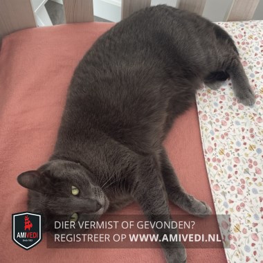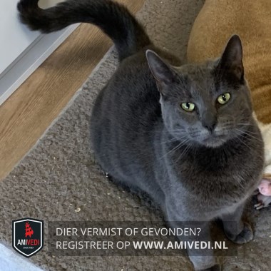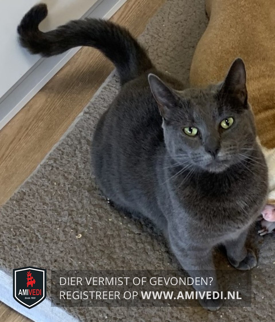 | Signalement | Ze is blauwgrijs, ze heeft geel/groene ogen, ze heeft een zwarte vlek op haar tong. Grijs/bruine voetkussentjes |