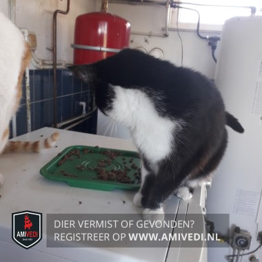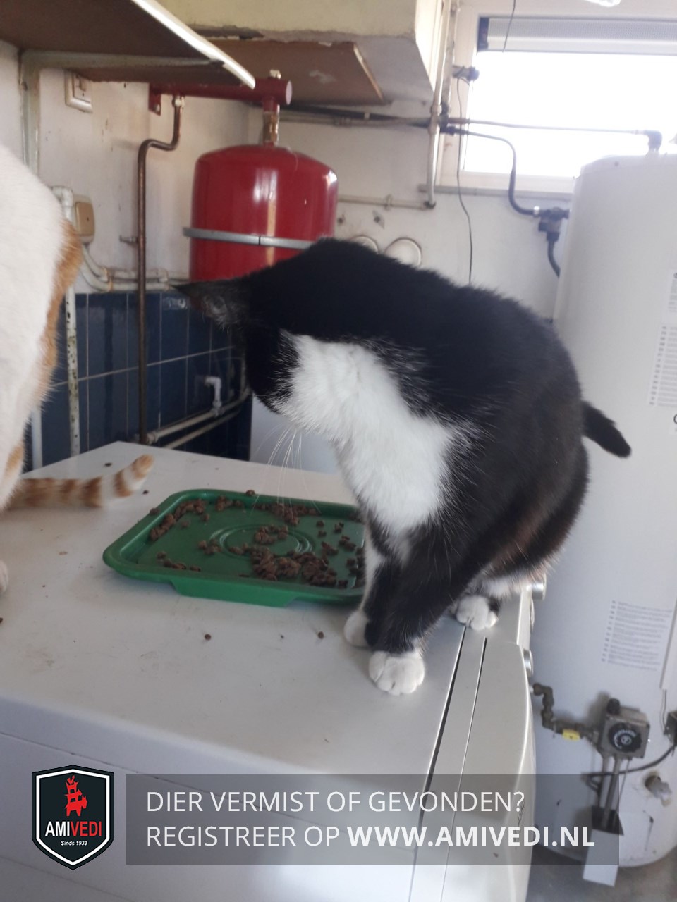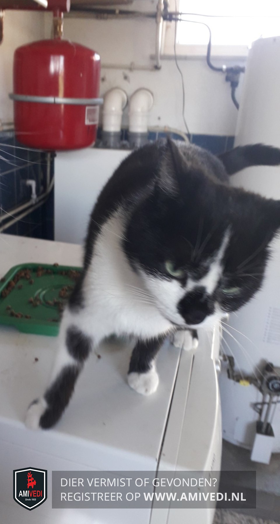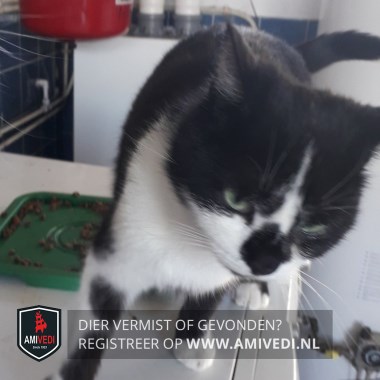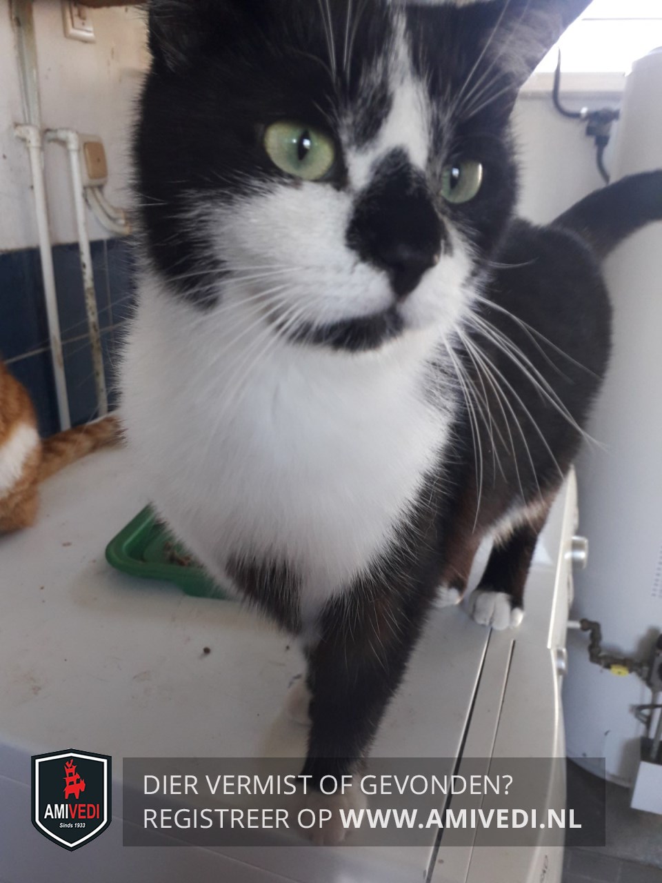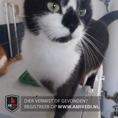 | Signalement | Zwart met witte snuit, zwart op neus en zwart plekje op bekje, witte kin, bef en borst, rechter voorpoot wit met met zwarte plekken, linker voorpoot zwart met witte teentjes, achterpoten zwart met witte teentjes. |