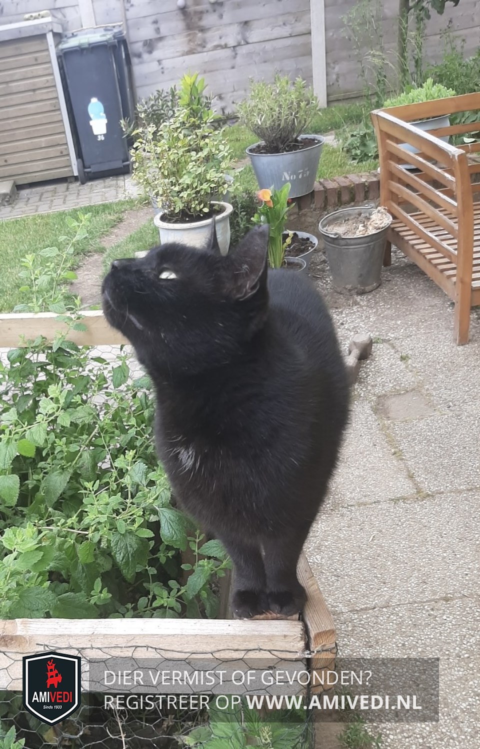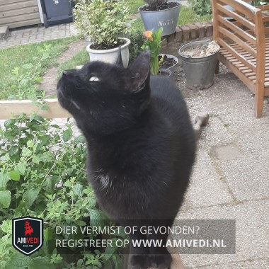 | Signalement | Zwart met op zijn borst een klein wit plekje. Wat grijze haartjes tussen zijn zwarte vacht. Zijn rechteroog heeft staar, hierdoor is dit oog troebel. Hij heeft last van zijn luchtwegen/astma en krijgt hiervoor elke dag medicatie. Zijn chip zit aan de bovenkant van zijn linkervoorpoot. |