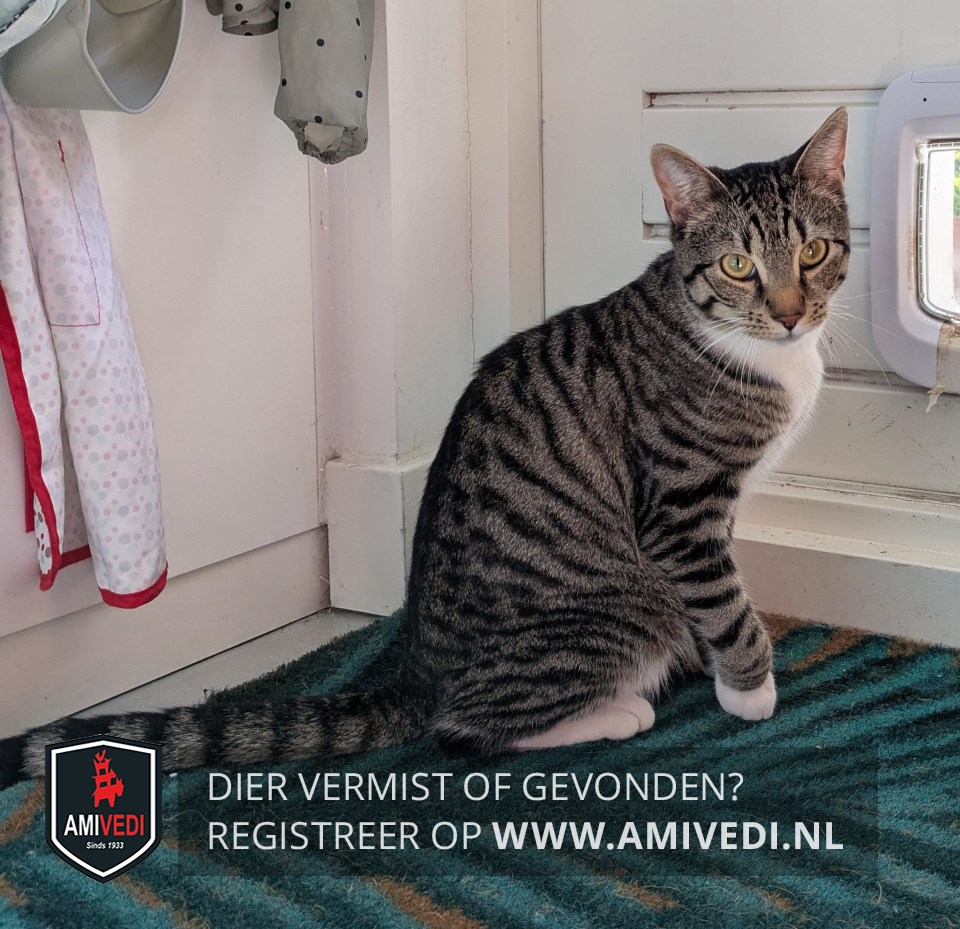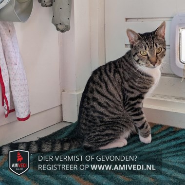 | Signalement | Grotendeels cypers met witte accenten. Zeer duidelijke streeptekening. Witte bef, borst, witte teentjes aan de rechtervoorpoot, witte kous aan de rechterachterpoot. |