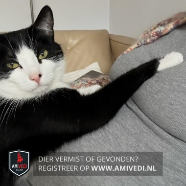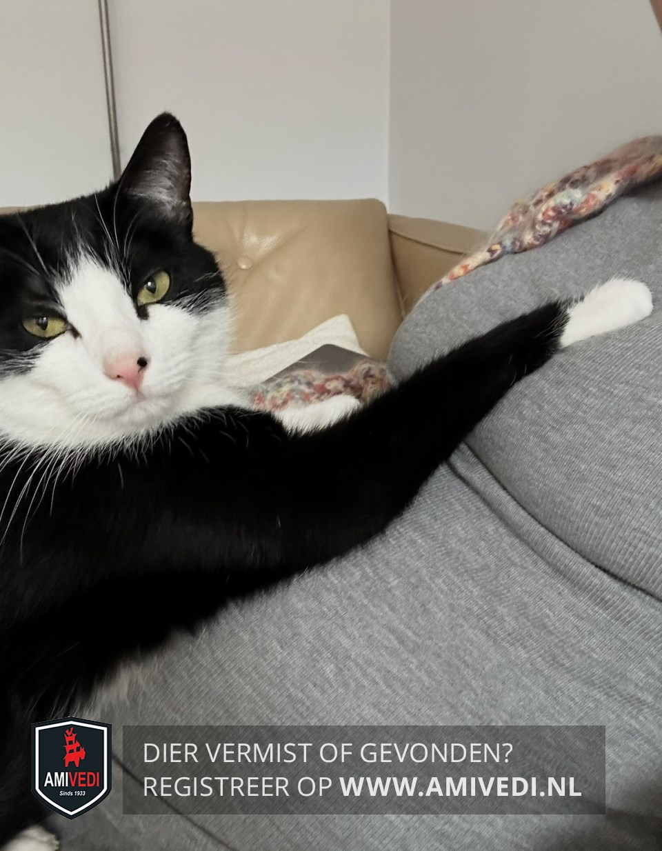 | Signalement | Zwart witte kater witte bek met een klein zwart puntje op de neus, witte kraag, 1 witte en 1 zwarte voorpoot. |