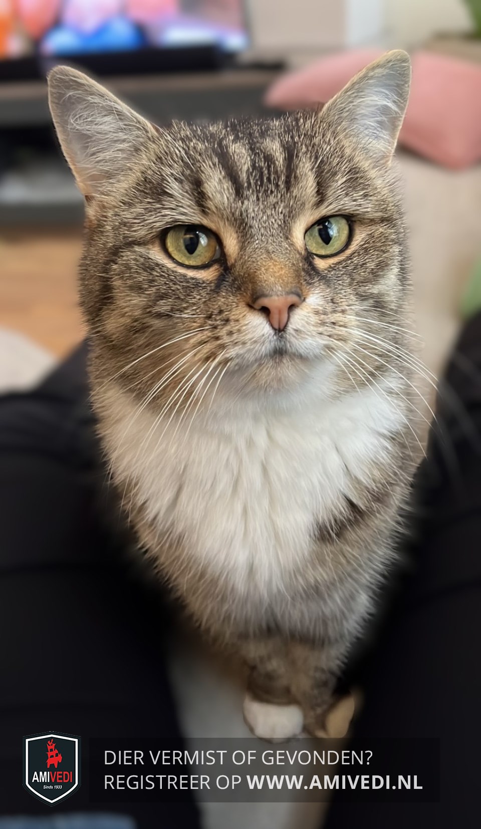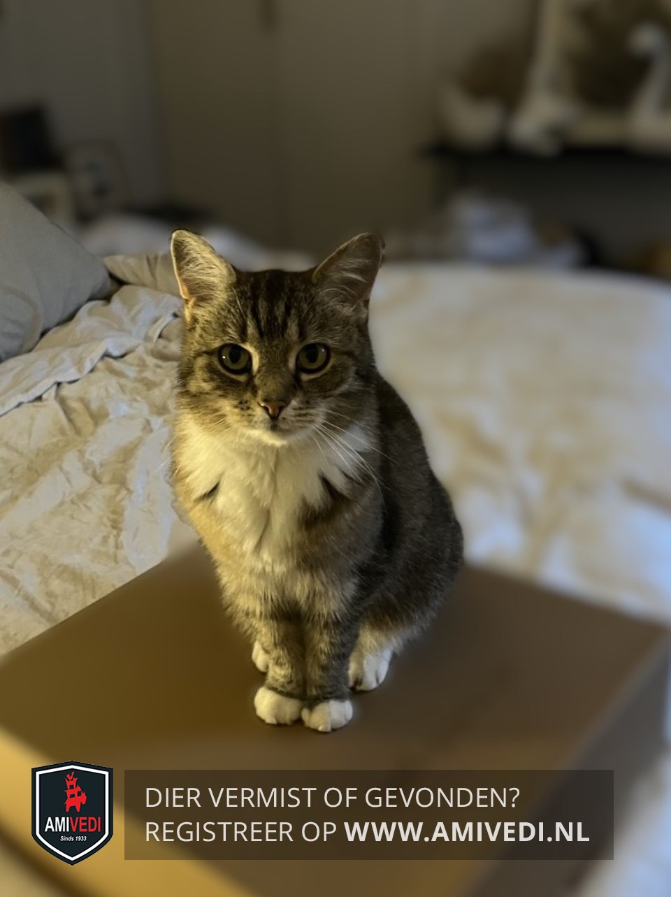 | Signalement | Cyperse poes, witte bef, witte sokjes en roze/zwarte voetkussentjes |