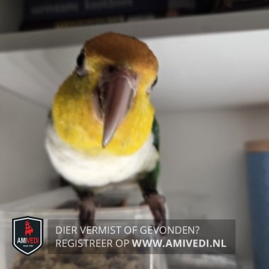 | Signalement | Witbuikparkiet. Groen, oranje kop, gele borst, witte buik. |