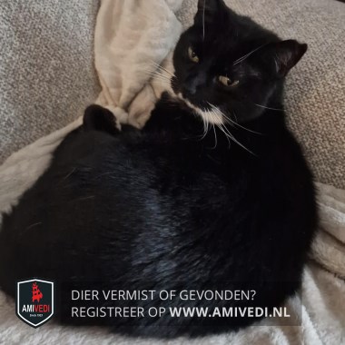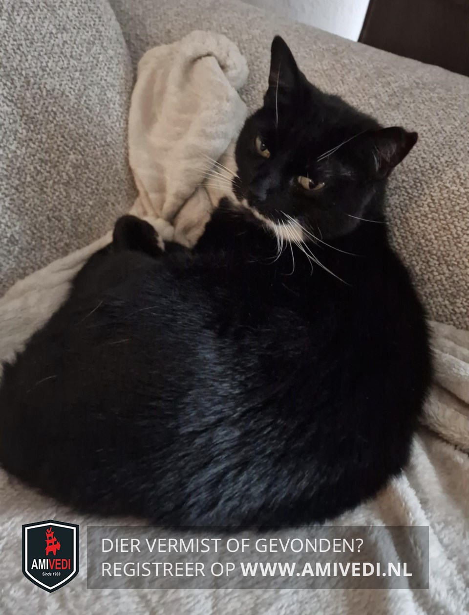 | Signalement | Zwart wit. Hapje uit linker oor bovenin nabij het topje van het oortje. Dunne witte snor onder het neusje, witte teentjes voor, witte voetjes achter. |