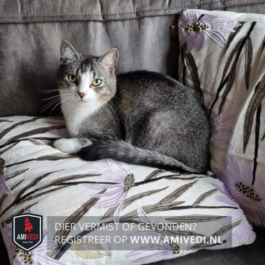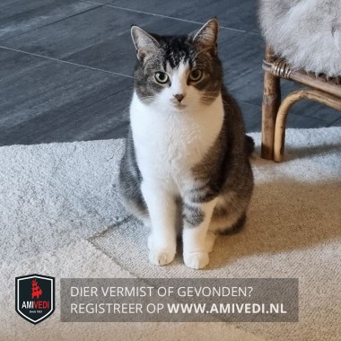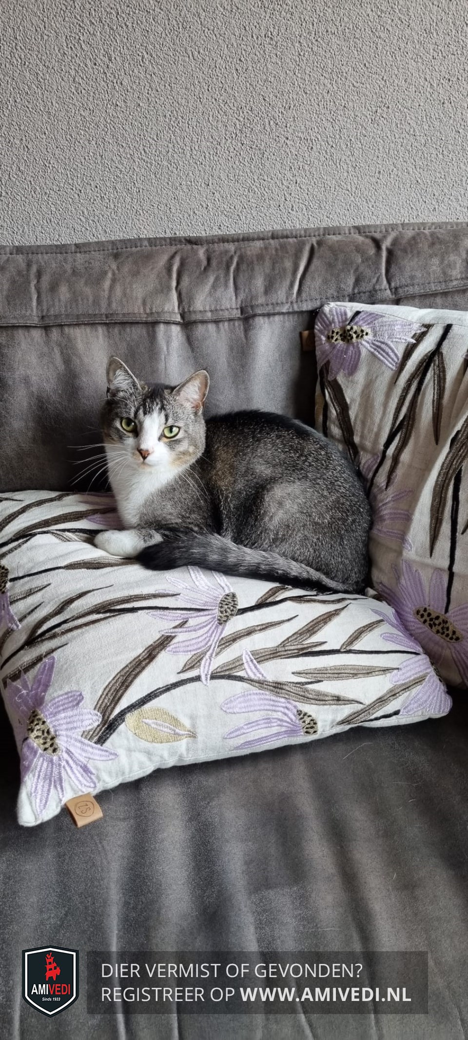 | Signalement | Gemarmerde grijze tekening met wit. Witte bles, snoet, kin, bef, borst en poten. Grijs vlekje aan de rechterkant van de neus. Linkervoorpoot heeft halverwege een grijze vlek. Recent geleden geopereerd aan blaas stenen. |