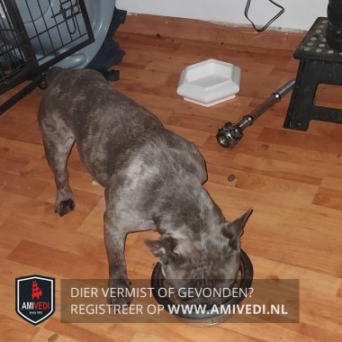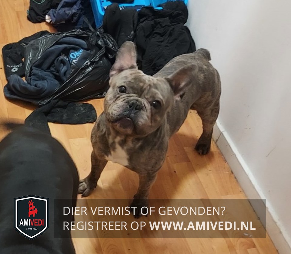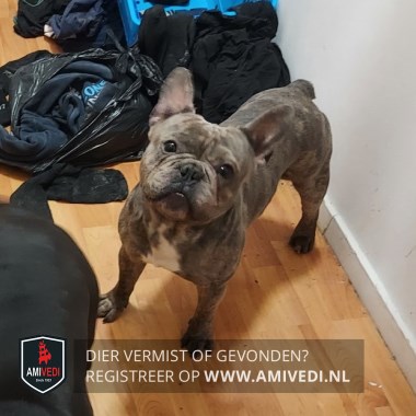 | Signalement | Franse Bulldog grijs-bruin gestroomlijnd met een witte plek op de borst, korte staart |