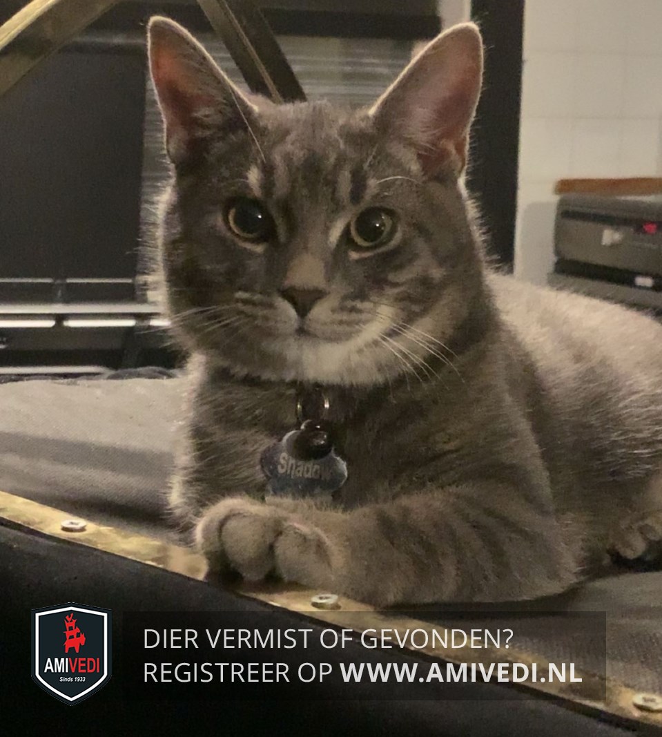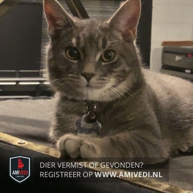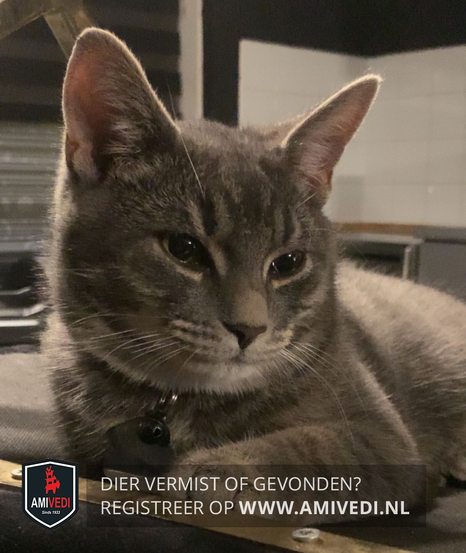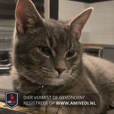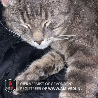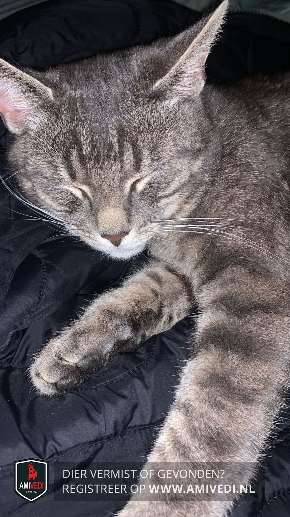 | Signalement | Cypers grijs gestreept met een witte kin. Halsbandje heeft hij niet meer om. |