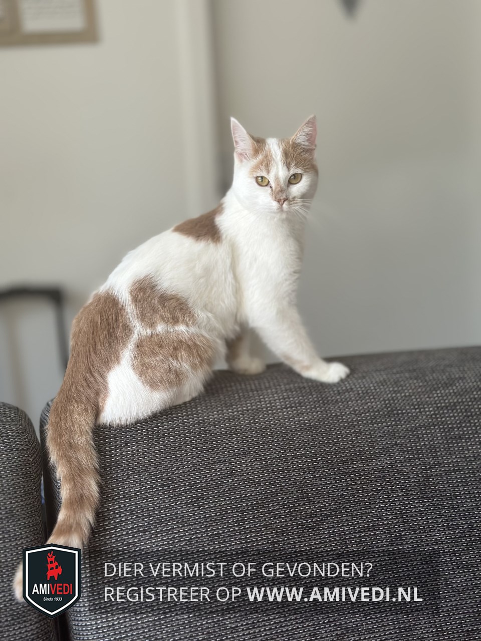 | Signalement | Europese korthaar poes, klein en slank, wit met licht oranje gevlekt. Bovenkant kopje licht oranje met brede bles tot achterkant kopje. Grote licht oranje vlek bovenop de rug t.h.v. schouderbladen. Aan rechterkant bij heup 2 grote licht oranje vlekken. Laatste deel van bovenkant rug licht oranje doorlopend naar licht oranje met wit geringde staart. |