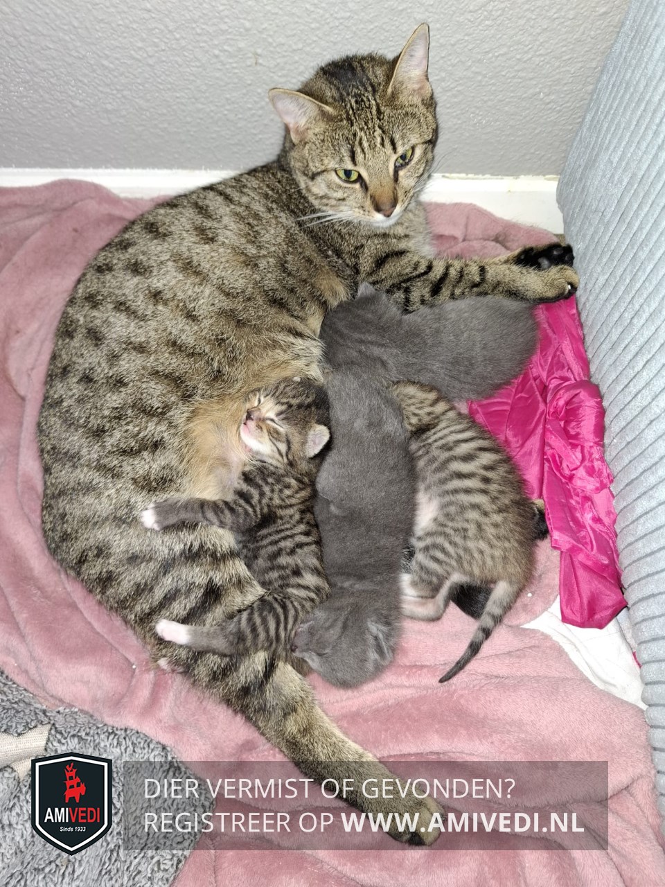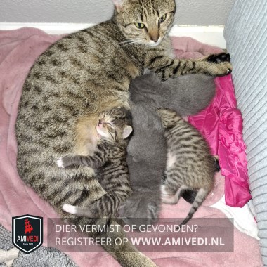 | Signalement | Kleine poes. Heeft een ontsteking bij haar linker oog gehad (nu een traanoog). oOder de bruine neus een klein wit "snorretje " Heeft stipjes i.p.v. streepjes |
