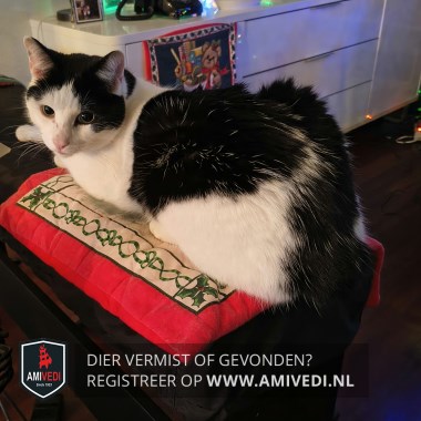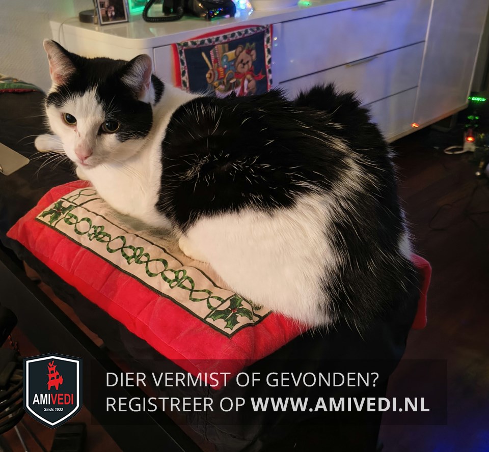 | Signalement | Wit met zwart boven de ogen en op kopje, zwart achter op de rug, zwarte staart. |