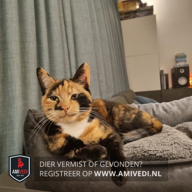 | Signalement | Schildpadpoes, met veel rood in het gezicht, oranje/zwarte oren, witte bef, donkere rug en poten. |