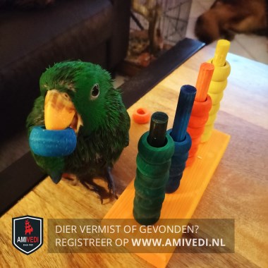 | Signalement | Edelpapegaai, man. Groen met een oranje/gele snavel. |